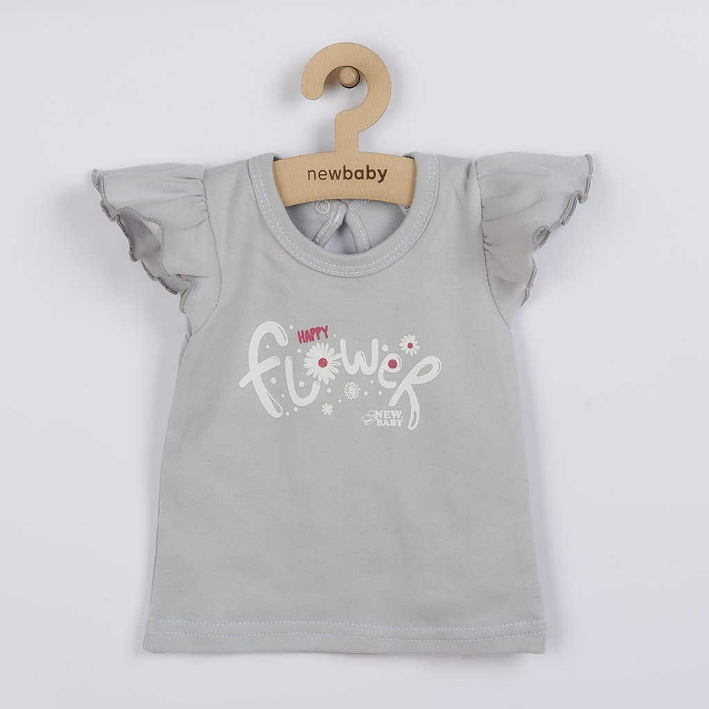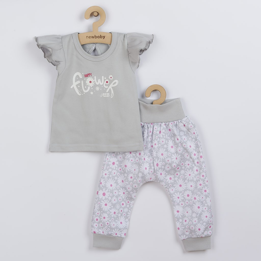 Roztomilá dívčí 2-dílná soupravička české značky New Baby Happy Flower pro miminka. Soupravička je vyrobena z velmi příjemného, měkkého a kvalitního materiálu, který je vhodný pro miminka. Obsahuje tričko a tepláčky. Tričko zdobí nápis Happy flower a šmrncovní volánkové rukávky. Zapínání na cvoček u krčku na zadní straně. Tepláčky mají širší lem, jsou zúžené na nohavičkách s lemem a jsou celopotištěné květinkami. V této soupravičce, která je precizně a kvalitně ušitá se bude miminko cítit velmi příjemně. Složení: 100% bavlna.