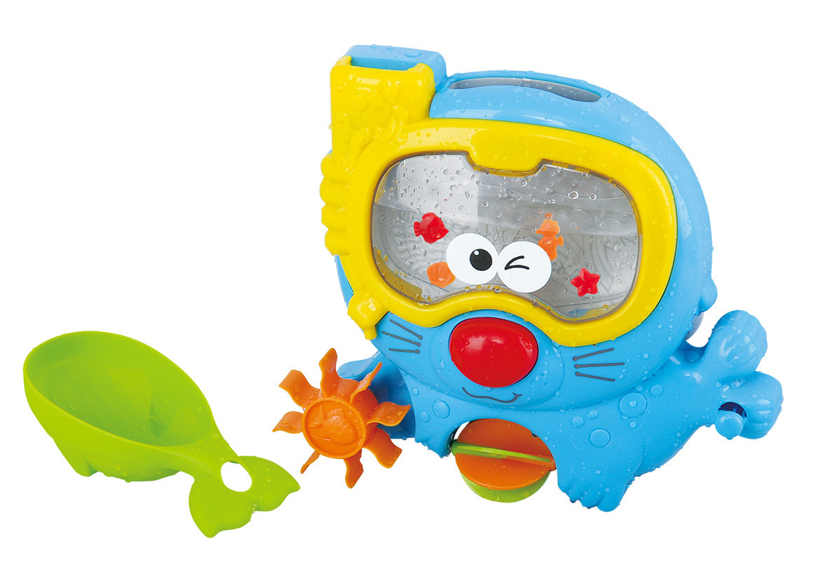 S touto novou hračkou se stane koupání zábavou. Vezmi přiloženou lžíci a doplň vodu tuleňovi do brýlí. Podívej! Plavou tam rybičky. Jakmile budou brýle plné vody, stačí stisknout tuleňovi nos a voda vyteče přes barevné mlýnky, které se roztočí.