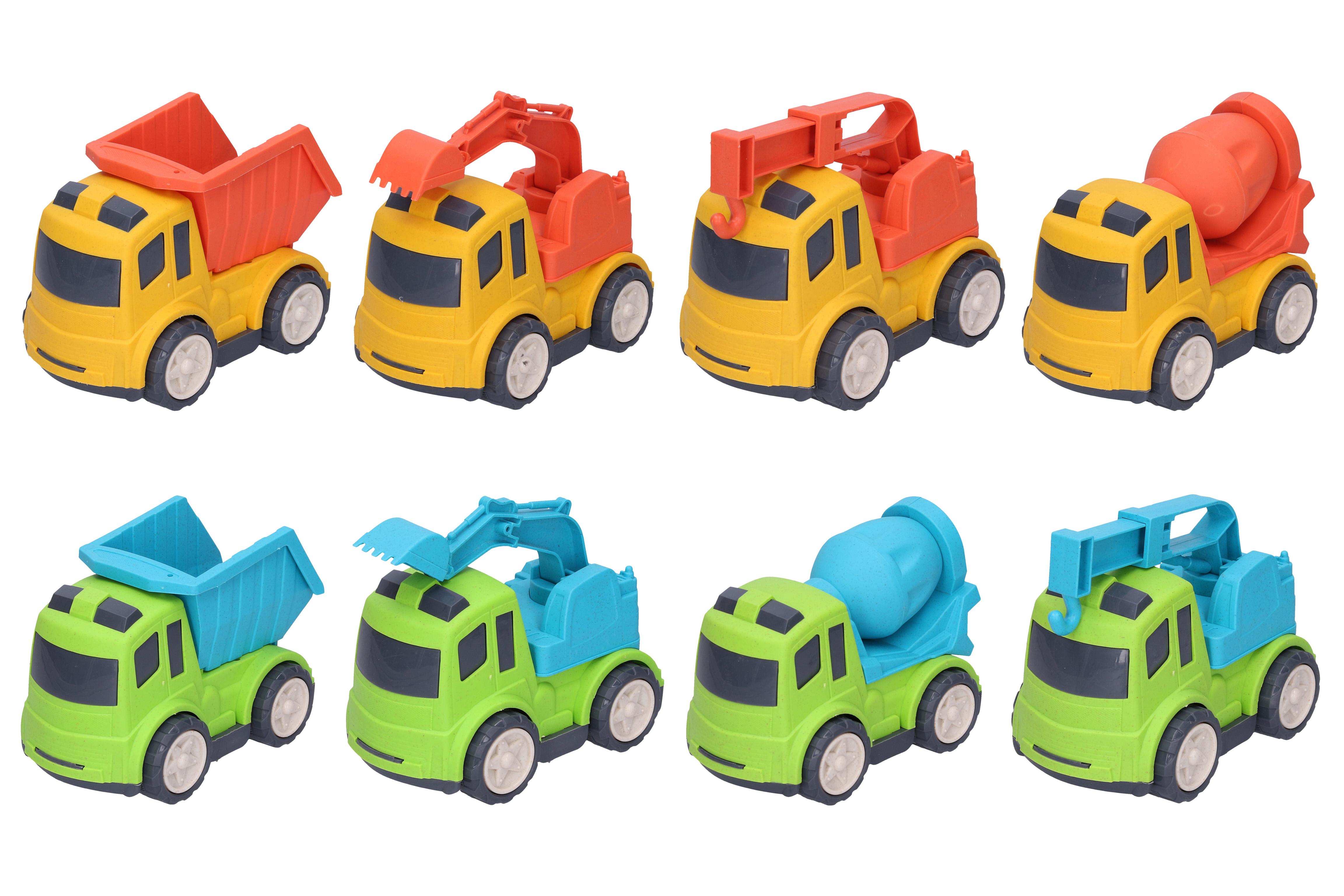 Auto stavební stroje. Velikost 17 cm. 4 varianty - bagr, jeřáb, domíchávač, sklápěč. 2 barevné varianty - modrá, červená. Volná kola.