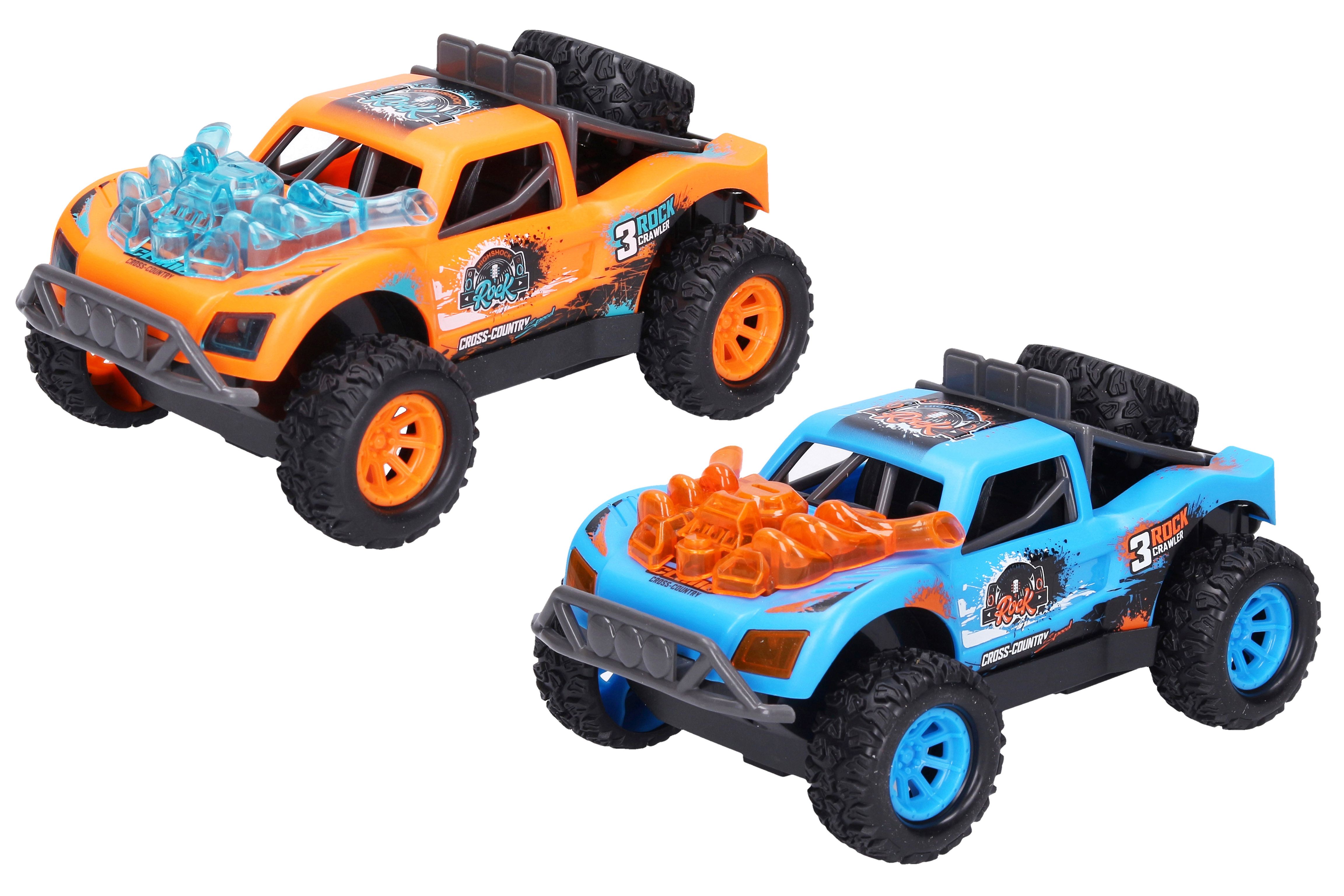 Auto terénní s efekty. Rozměry 15x9,5x8,8 cm. Na setrvačník. Při jízdě se pohupuje motor. Světelné a zvukové efekty zatlačením rezervního kola dolů. 3xAG13 baterie součástí. 2 varianty - modrá, oranžová.