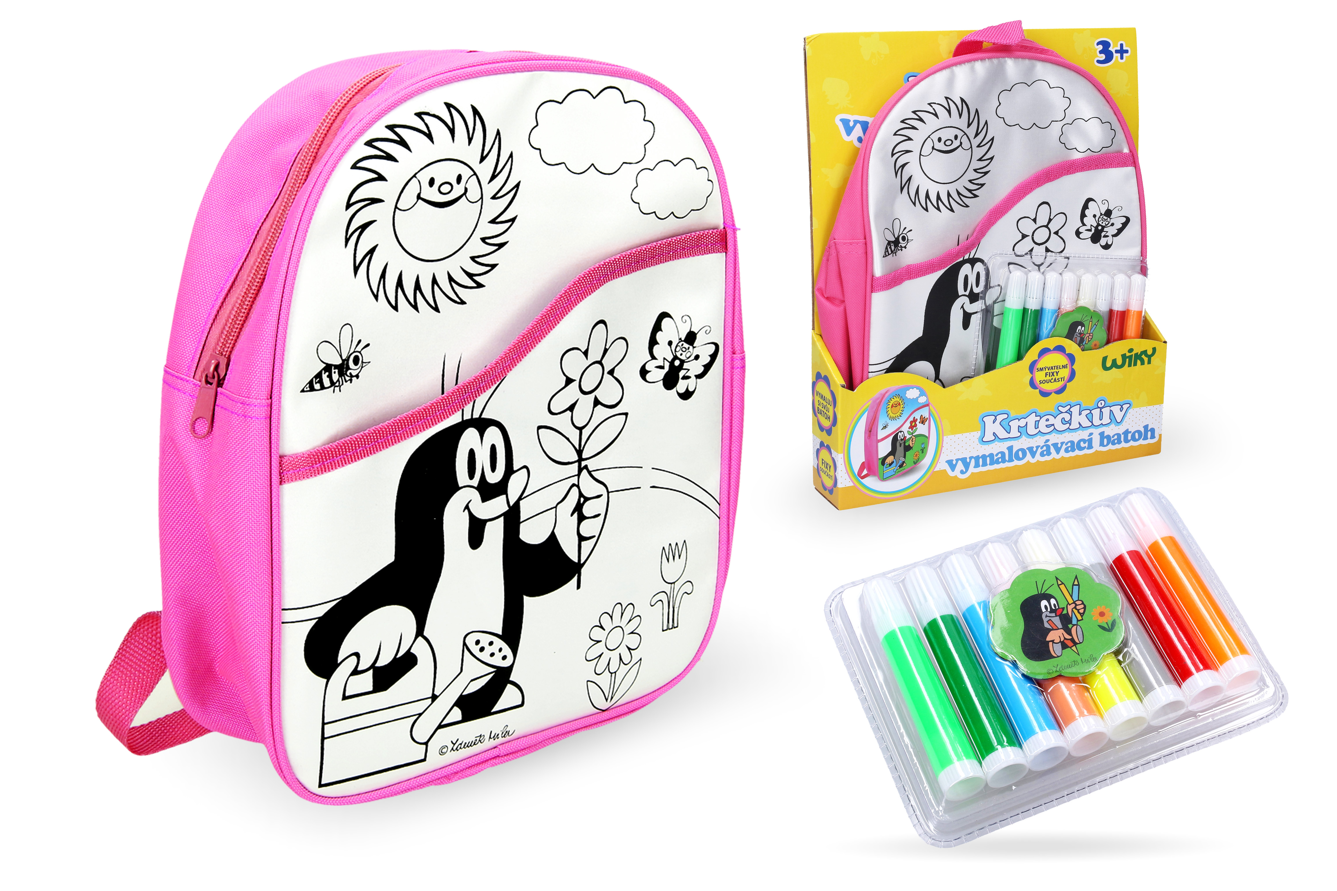 Vymalovávací batoh Krtek. Růžová barva. Rozměry 30 x 27,5 cm. Balení obsahuje 8 barevných fixů na textil. Barvy jsou smývatelné studenou vodou. Doporučený věk: od 3 let