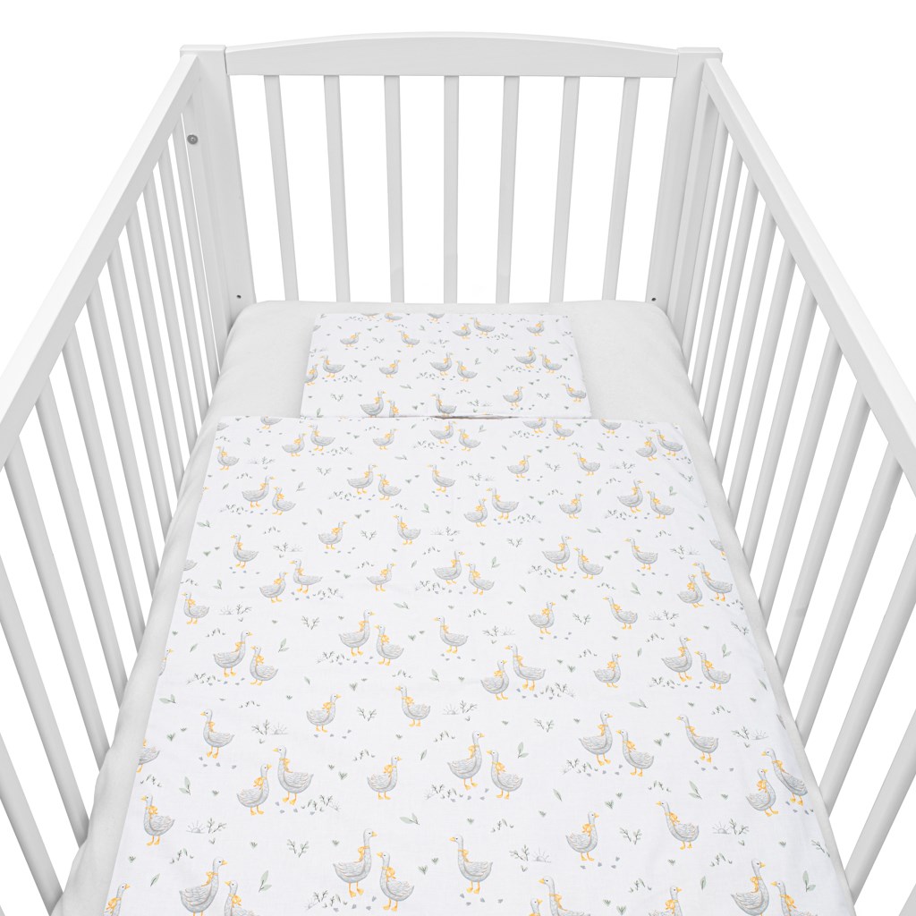 Nádherný bavlněný set s výplní do postýlky New Baby Husičky. Set obsahuje polštářek a peřinku s potiskem. Krásný dětský motiv s roztomilými husičkami, polahodí dětským očičkám. Set je vyplněn antialergickým vláknem a je ušit z vysoce kvalitní bavlny. Bavlněný set luxusně a jemně pohladí a zahřeje pokožku vašeho miminka. Rozměry: polštář: cca 60x40 cm, peřinka: cca 90x120 cm.