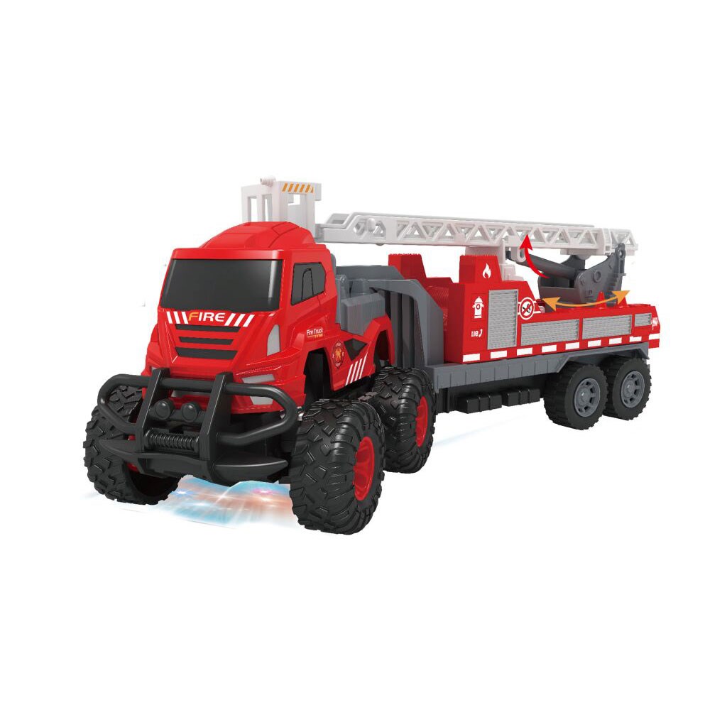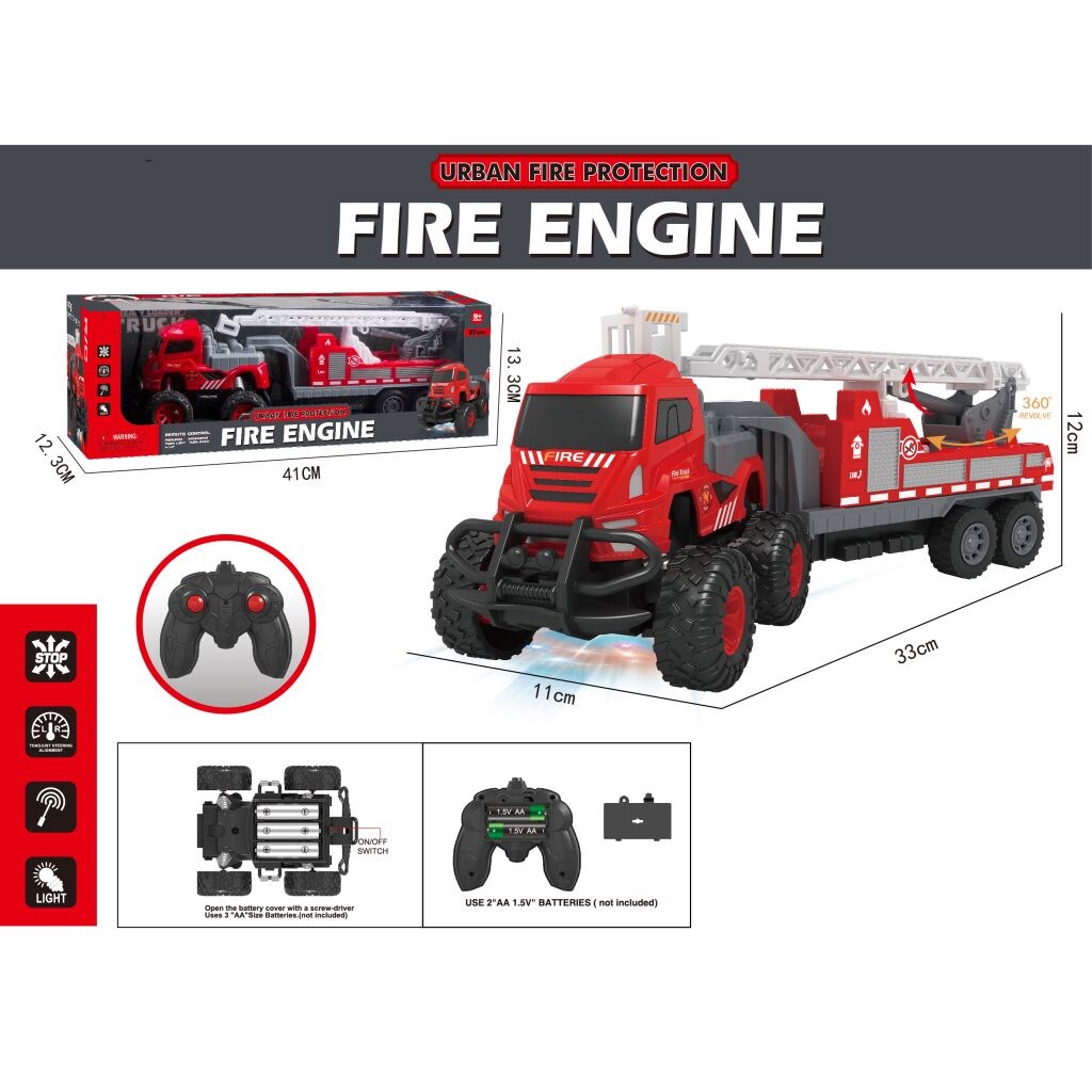 Auto tahač hasičský RC na dálkové ovládání. Rozměry 33x11x12 cm. Světelné efekty. 3xAA baterie do auta, 2xAA do ovladače nejsou součástí.