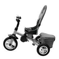 Dětská šlapací tříkolka Baby Mix TYPHOON je multifunkční dopravní prostředek a je typickým příkladem produktů GROW UP - roste zároveň s dítětem. Tříkolku může ovládat jak dítě, tak i rodič pomocí nastavitelné vodící tyče. Po odebrání vodící tyče, sklápěcí stříšky a opěrek bude sloužit jako klasická šlapací tříkolka. Pevná ocelová konstrukce zajistí dítěti bezpečnost a zaručí její používání po mnoho let. Pohodlné a ergonomicky tvarované sedadlo je otočné o 360 stupňů, což umožní dítěti cestovat ve směru nebo proti směru jízdy. O pohodlí a bezpečí během jízdy se stará odnímatelná hrazda, tříbodové bezpečnostní pásy, pohodlné odnímatelné stupačky nebo gumová kola, která skvěle absorbují nerovnosti, poskytují perfektní přilnavost a nevyžadují huštění. Pro uložení hraček nebo potřeb pro dítě je zde praktický úložný košík.