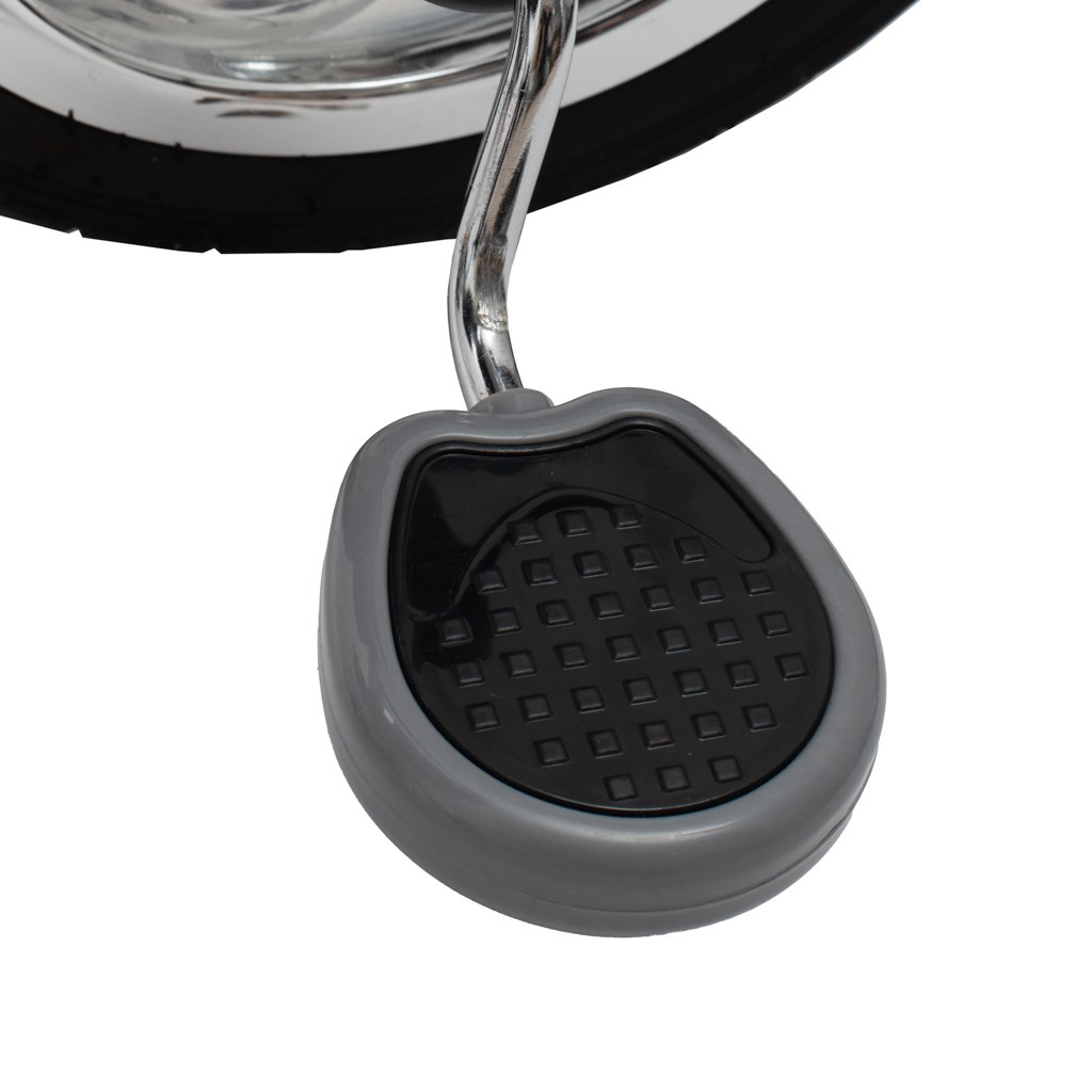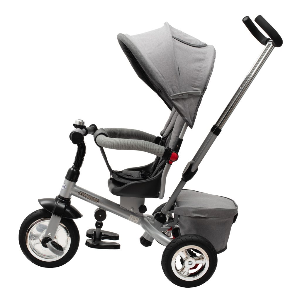 Dětská šlapací tříkolka Baby Mix TYPHOON je multifunkční dopravní prostředek a je typickým příkladem produktů GROW UP - roste zároveň s dítětem. Tříkolku může ovládat jak dítě, tak i rodič pomocí nastavitelné vodící tyče. Po odebrání vodící tyče, sklápěcí stříšky a opěrek bude sloužit jako klasická šlapací tříkolka. Pevná ocelová konstrukce zajistí dítěti bezpečnost a zaručí její používání po mnoho let. Pohodlné a ergonomicky tvarované sedadlo je otočné o 360 stupňů, což umožní dítěti cestovat ve směru nebo proti směru jízdy. O pohodlí a bezpečí během jízdy se stará odnímatelná hrazda, tříbodové bezpečnostní pásy, pohodlné odnímatelné stupačky nebo gumová kola, která skvěle absorbují nerovnosti, poskytují perfektní přilnavost a nevyžadují huštění. Pro uložení hraček nebo potřeb pro dítě je zde praktický úložný košík.