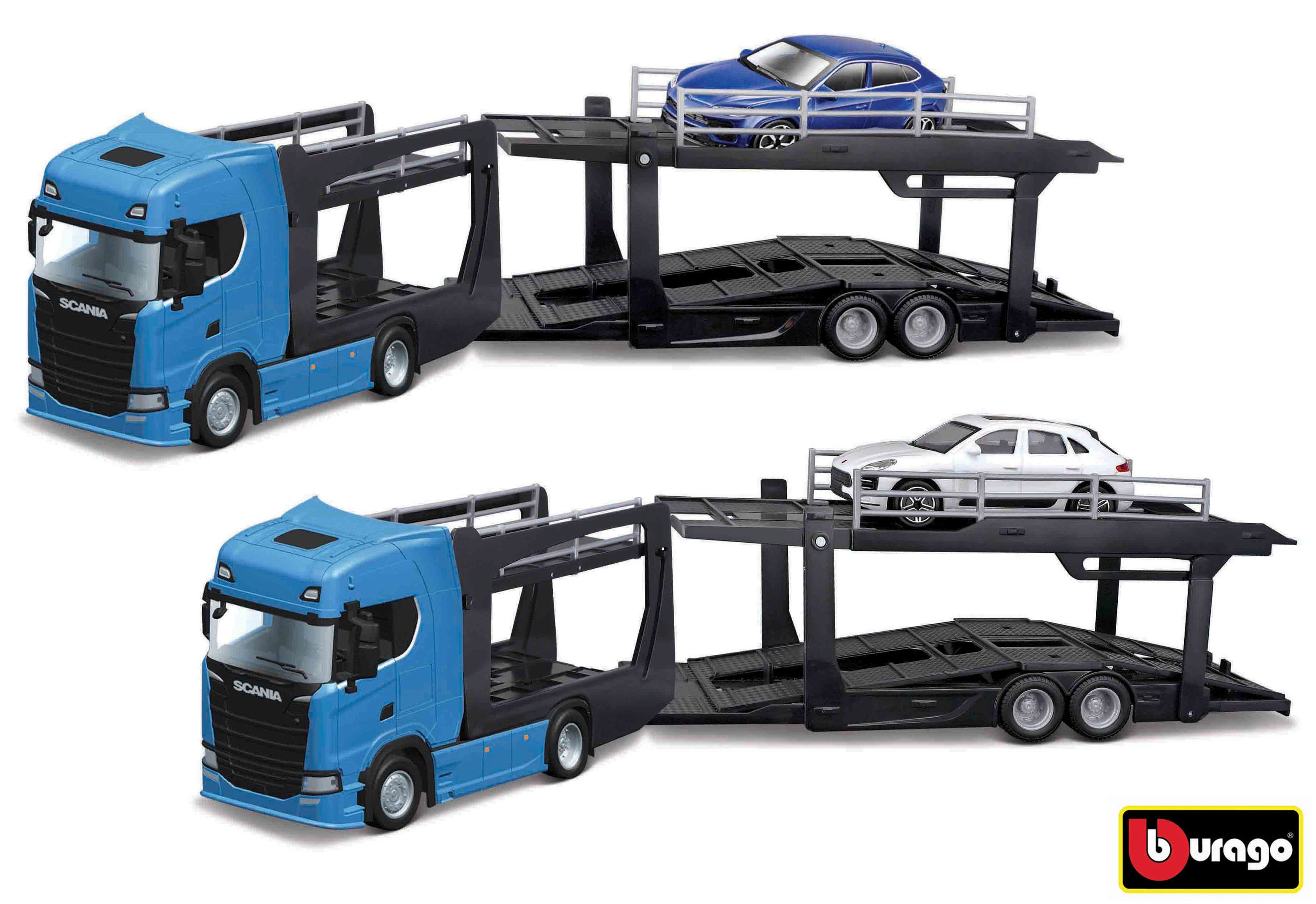 Kovový model Kamion - Bburago 1:43 Kamion Multicar Carrier Scania 770S Black + Lamborghini Urus