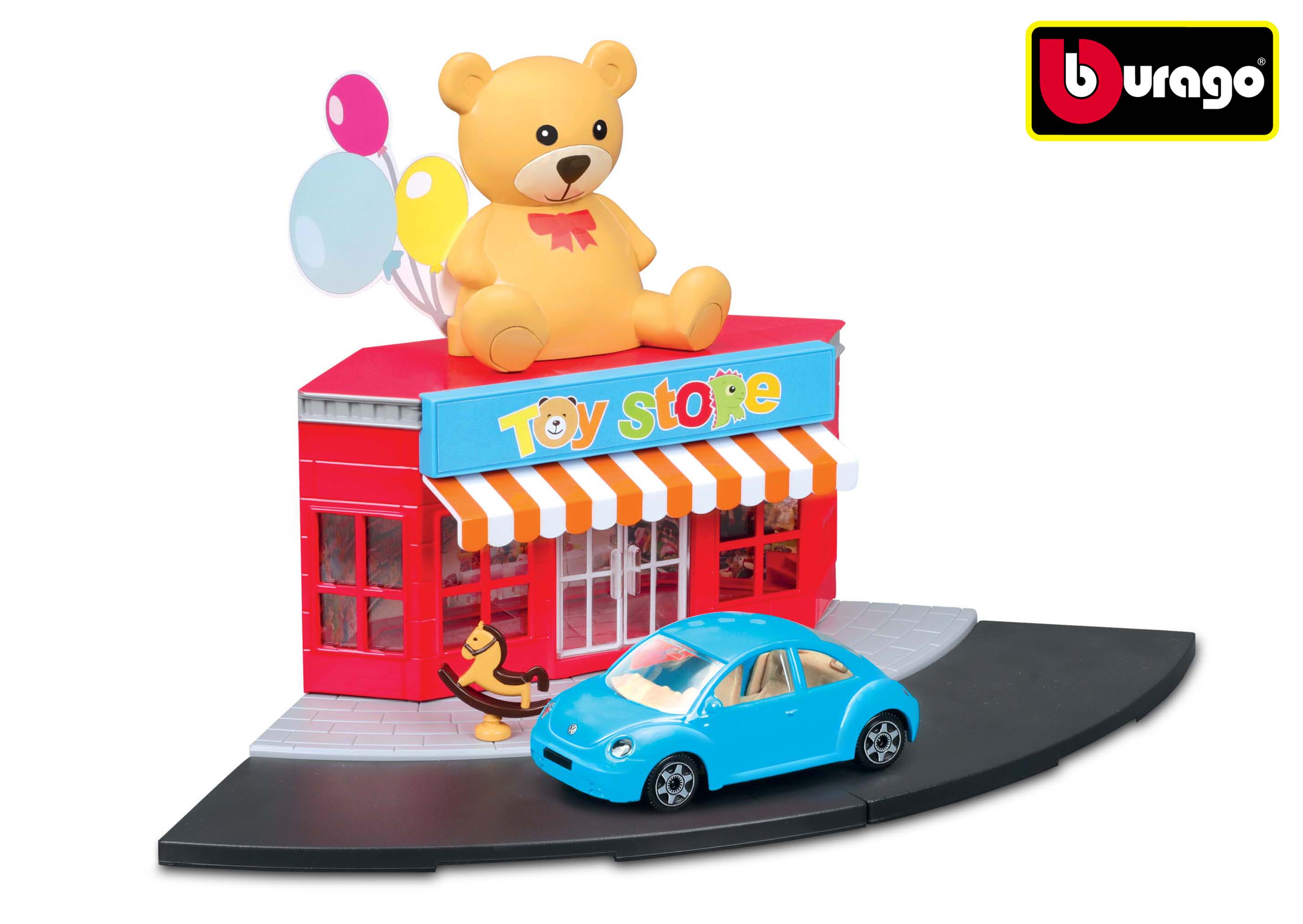 Hračkířství obsahuje kromě plastové budovy s pohyblivými dveřmi také pouliční a chodníkový komponent a různé doplňky.