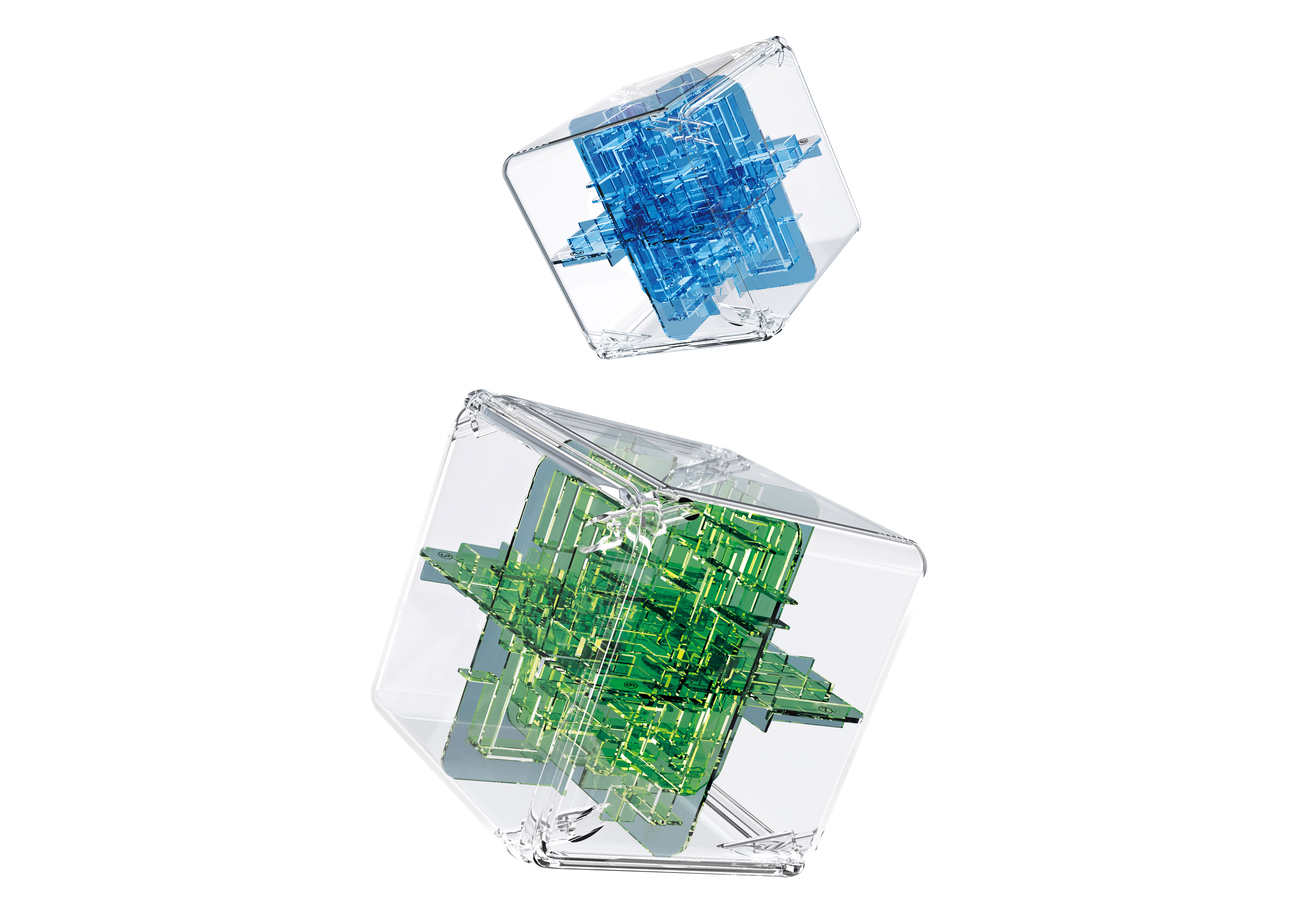 Bludiště 3D kostka. Velikost 9cm. Cílem je dostat kuličku do jamky. Lze postupovat podle číslic na jednotlivých stěnách. 2 varianty - modrá, zelená.