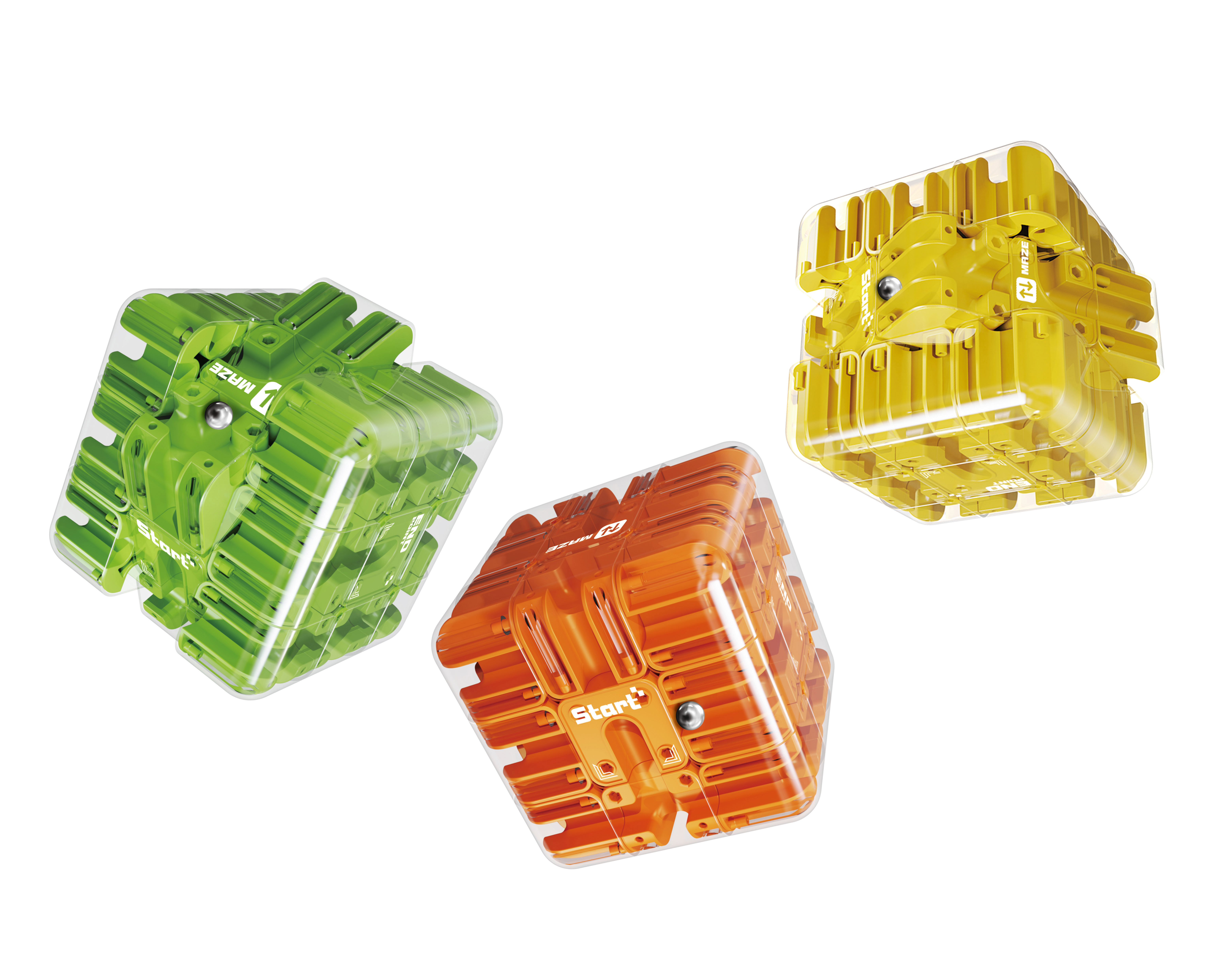 Bludiště kostka. Velikost 8 cm. Cílem hry je dostat kuličku do cíle pomocí otáčení vrstev kostky. Návod součástí balení. 3 varianty - žlutá, oranžová, zelená.
