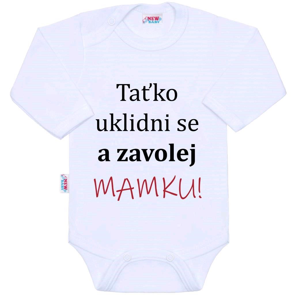 Originální bavlněné kojenecké body s dlouhým rukávem New Baby, s vtipným nápisem Taťko uklidni se a zavolej MAMKU! Barvy použité k potisku jsou certifikované a vhodné pro miminka. Je vyrobeno z příjemného a kvalitního materiálu, ve kterém se bude Vaše miminko cítit příjemně. Body má zapínáni na cvočky na ramínku a mezi nožičkami, což usnadňuje oblékání a přebalování. Dopřejte Vašemu miminku vyniknout v originálním body. Složení: 100% bavlna. Rozměry: obvod kolem hrudníku cca 34 cm, délka rukávu cca 16 cm, celková délka cca 30 cm.