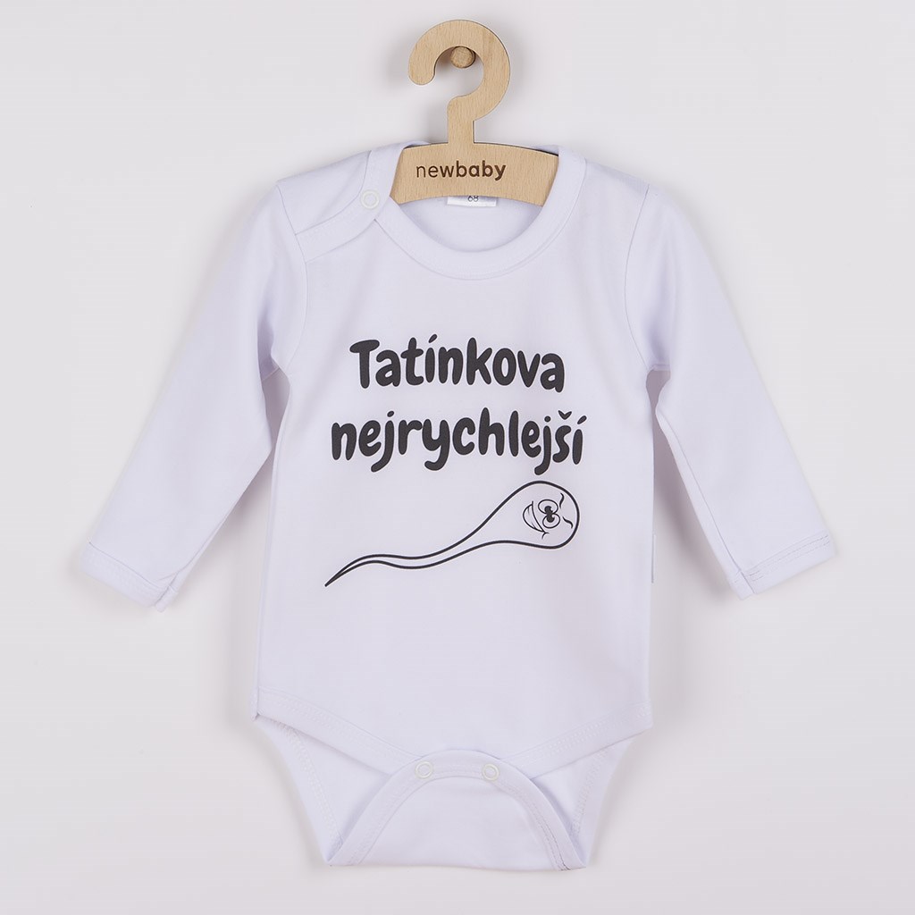 Originální bavlněné kojenecké body s dlouhým rukávem New Baby, s vtipným nápisem TATÍNKOVA NEJRYCHLEJŠÍ. Barvy použité k potisku jsou certifikované a vhodné pro miminka. Je vyrobeno z příjemného a kvalitního materiálu, ve kterém se bude Vaše miminko cítit příjemně. Body má zapínáni na cvočky na ramínku a mezi nožičkami, což usnadňuje oblékání a přebalování. Dopřejte Vašemu miminku vyniknout v originálním body. Složení: 100% bavlna. Rozměry: obvod kolem hrudníku cca 34 cm, délka rukávu cca 16 cm, celková délka cca 30 cm.
