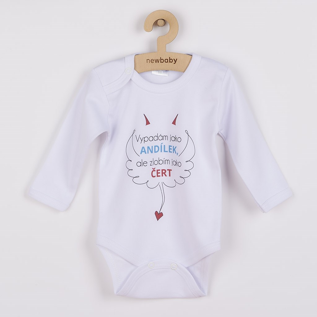 Originální bavlněné kojenecké body s dlouhým rukávem New Baby, s vtipným nápisem Vypadám jako ANDÍLEK, ale zlobím jako ČERT a zajímavou kresbou. Barvy použité k potisku jsou certifikované a vhodné pro miminka. Je vyrobeno z příjemného a kvalitního materiálu, ve kterém se bude Vaše miminko cítit příjemně. Body má zapínáni na cvočky na ramínku a mezi nožičkami, což usnadňuje oblékání a přebalování. Dopřejte Vašemu miminku vyniknout v originálním body. Složení: 100% bavlna. Rozměry: obvod kolem hrudníku cca 34 cm, délka rukávu cca 16 cm, celková délka cca 30 cm.