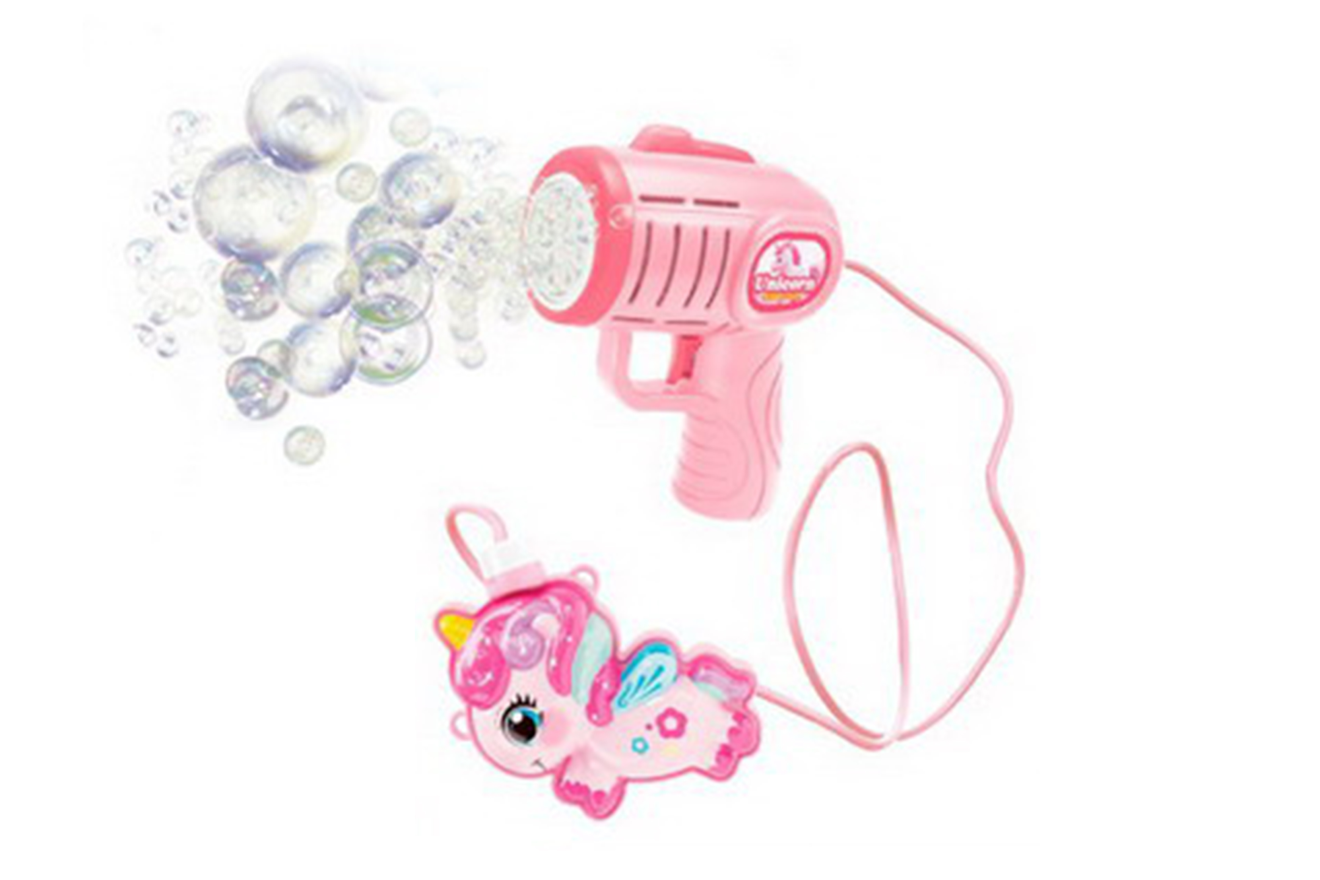 Bublifuk pistole s externí nádržkou jednorožec. Objem 280 ml. Rozměry 12,3x6,8x15 cm. 3xAA baterie nejsou součástí.