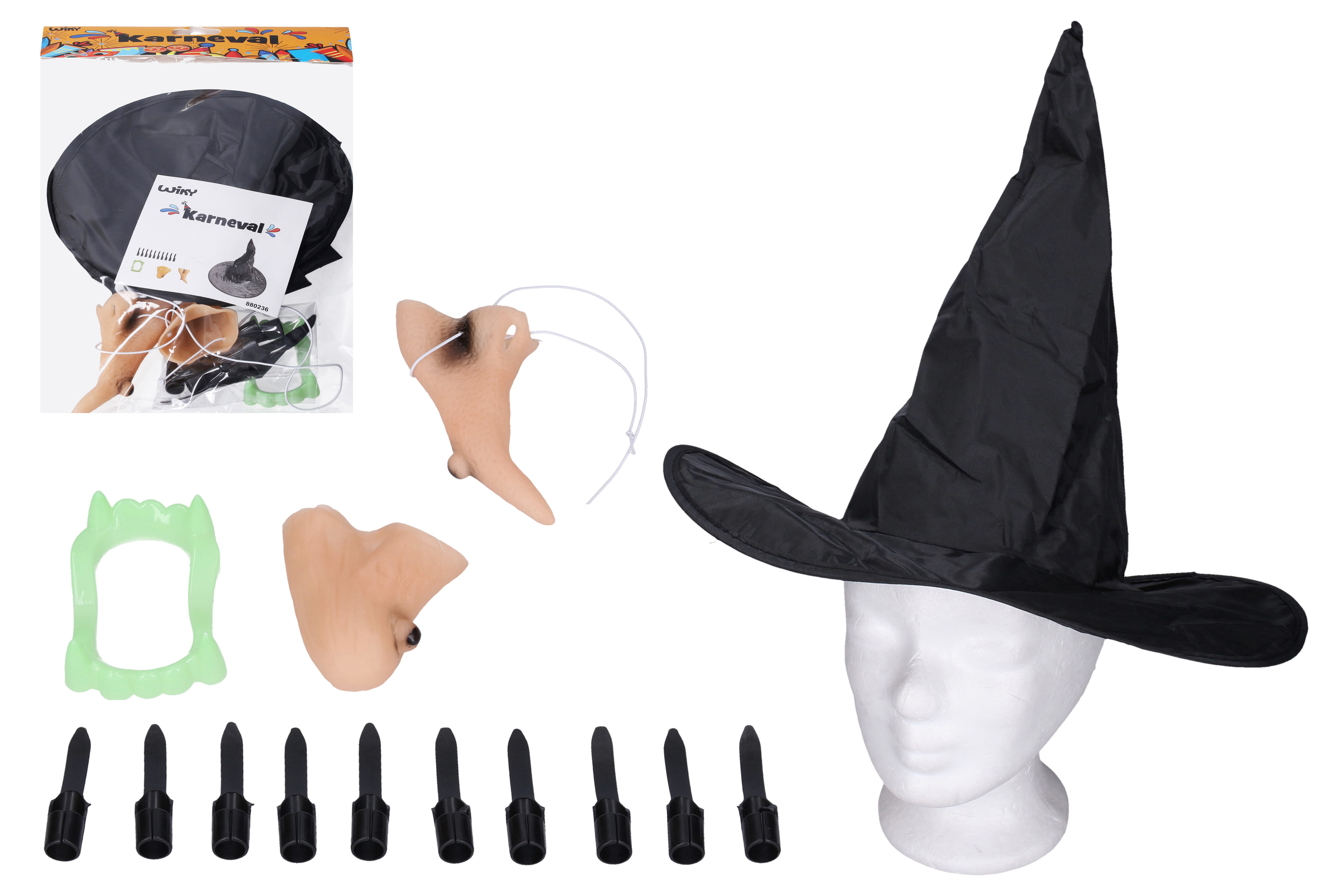 Set pro každou správnou čarodějnici Set obsahuje: bradu na gumičce, nos na gumičce, 10 nasazovacích prstů s nehty, zuby a velký čarodějnický klobouk