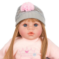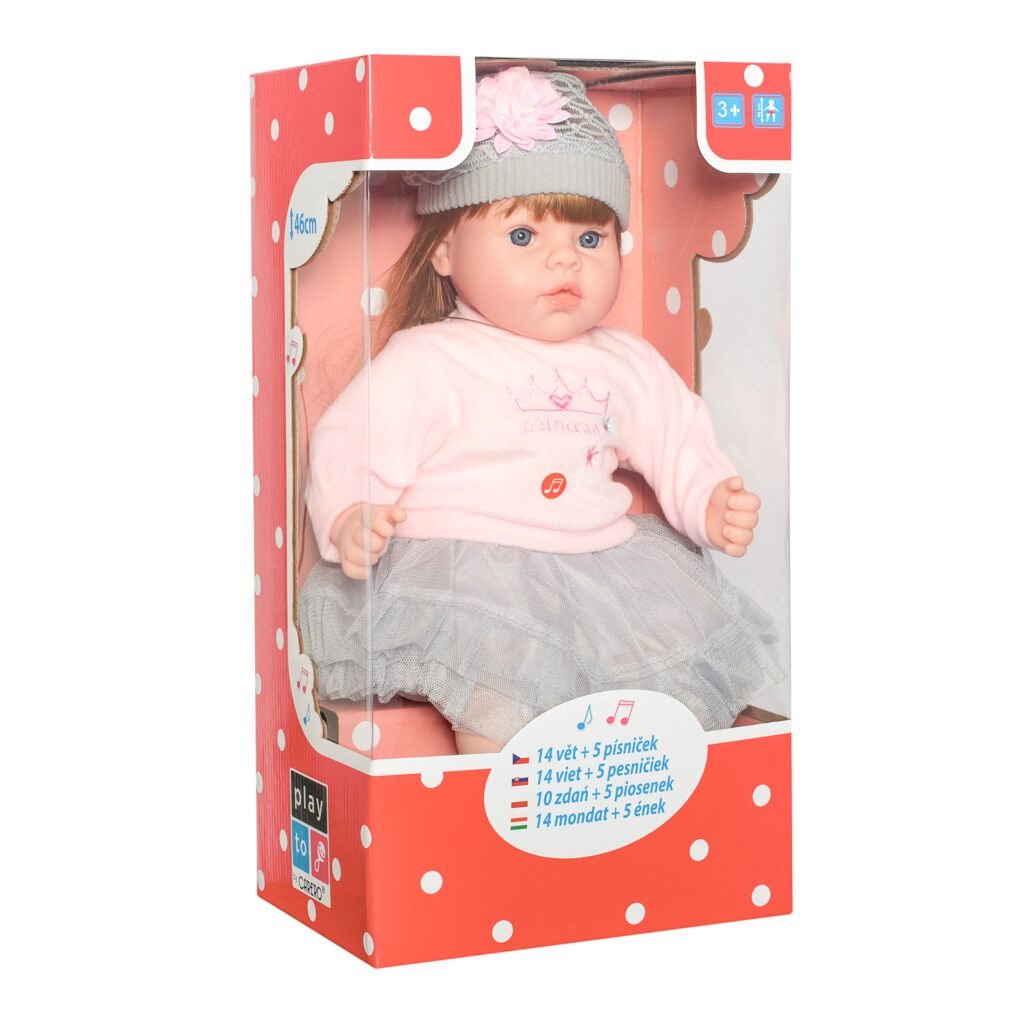Krásná dětská panenka PlayTo Nina. Skvělá hračka pro každou holčičku, která bude mít svoje mluvící miminko. Hlava, ruce a nohy jsou vyrobeny z gumy, tělíčko pak z měkkého materiálu, díky čemuž se může dítě k panence krásně přitulit. Panenka má milou tvářičku, která vypadá jak opravdové miminko a získá si srdce holčičky svými modrými kukadly a růžovými rtíky. Má roztomilé oblečení, jako je tylová sukýnka, tričko s nápisem, ponožky a čepička. Oblečení lze sundat a vyprat. Délka panenky je 46 cm, je zabalená v barevné krabici a hodí se jako milý dáreček. Nina se stane nejlepší kamarádkou vašeho děvčátka. Panenka má česky mluvící modul, který se nachází v kapsičce na bříšku. Modul po stisknutí přehrává 5 písní a mluví 14 českých vět.