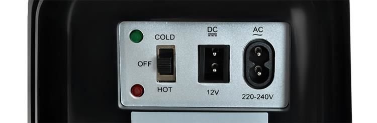 Nápoje do výšky 19 cm lze snadno uložit. Lednička se napájí ze sítě nebo auta. Praktické madlo usnadňuje přenášení. Přepínání mezi funkcí chlazení a ohřevu je vzadu, signalizované LED diodou.