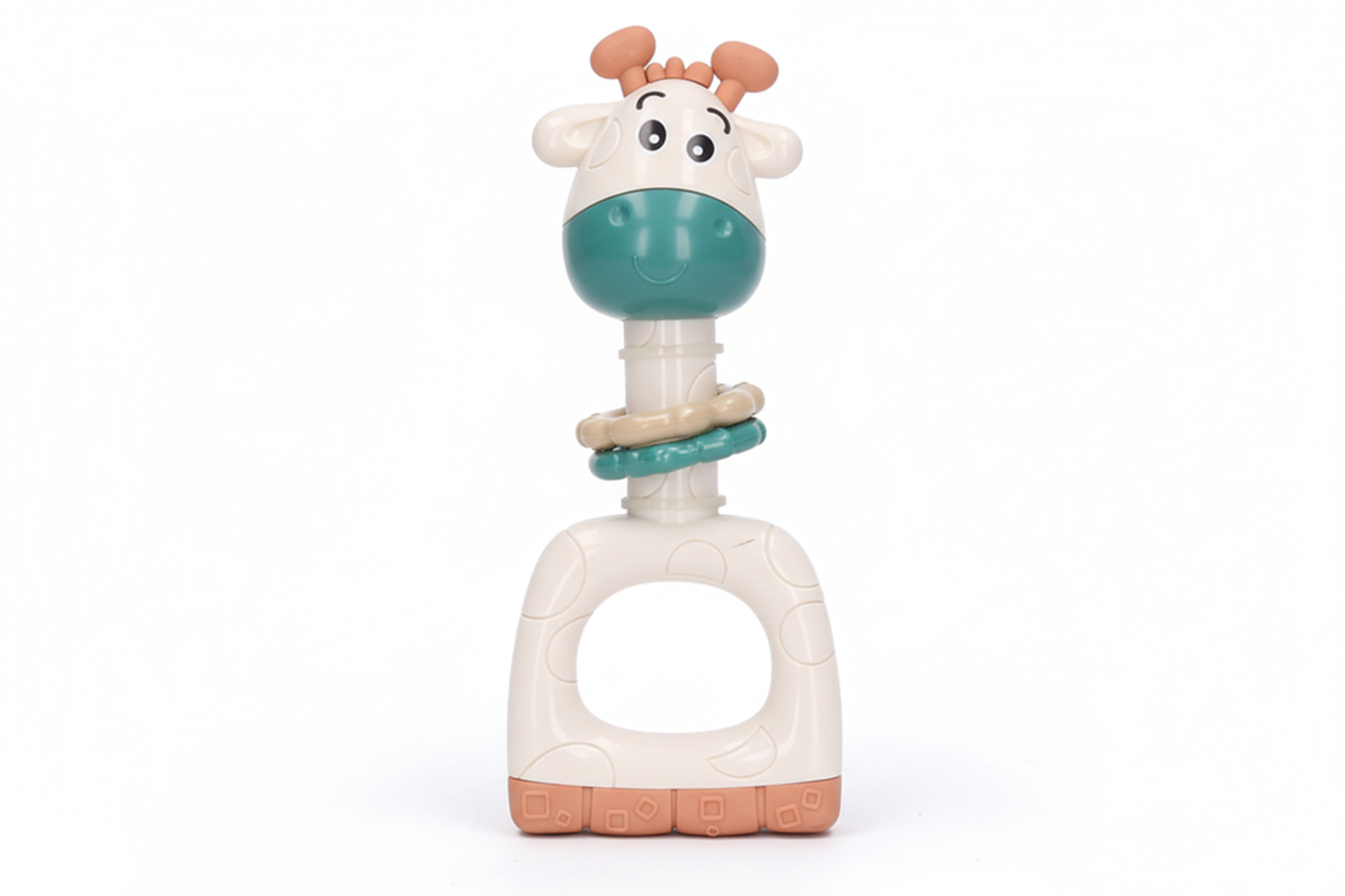 Chrastítko pískací žirafa. Velikost 16 cm. Zmáčknutím hlavy směrem dolů píská.