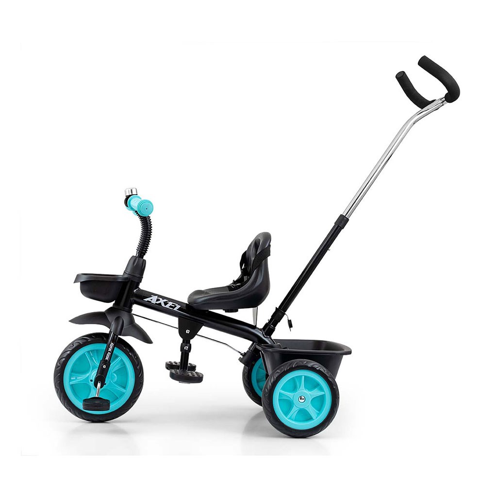 Dětská šlapací tříkolka s rukojetí Axel je určena pro děti ve věku od 1 do 3 let. Je vyrobena z kvalitních a odolných materiálů. Má pohodlné a ergonomicky tvarované sedlo, jehož vzdálenost k řídítkům lze snadno nastavit a tím přizpůsobit tříkolku věku a výšce dítěte. Tříkolka patří k produktům skupiny GROW UP, tedy roste s dítětem. Na předním kole lze uvolnit náhon na pedály a pomocí vodící tyče tlačit malého závodníka, když mu dojdou síly. Široká kola vyrobená z tvrzené pěny EVA, zaručí pohodlí a odolnost na každém povrchu. Do dvou praktických košíků si váš malý závodník naskládá všechny potřebné hračky a může vyrazit vstříc dobrodružství. Kombinace kovové konstrukce a součástek vyrobených z nejkvalitnějších materiálů zaručuje odolnost za všech podmínek. Pro maximální bezpečí dítěte má tříkolka bezpečnostní pásy.