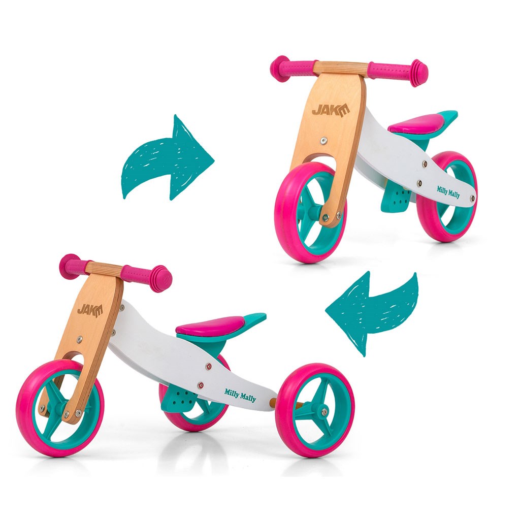 Dětské multifunkční dřevěné odrážedlo Milly Mally JAKE je ideální pro děti, které se právě začínají učí jezdit na kole a přitom nejsou schopné udržet rovnováhu na dvou kolech. Výhodou odrážedla JAKE je, že z tříkolky se snadno stane odrážedlo na dvou kolech. Je vyrobeno z pevného dřeva s krásnými veselými barvami, obrázky s pěnovými koly. Široké rozestupy kol poskytují extrémní stabilitu, bezpečnost a pohodlí doma i venku. Měkká neklouzavá rukojeť zajistí ochranu ruky dítěte. Krásné multifunkčí odrážedlo, které padne do oka jak holčičkám tak chlapečkům.