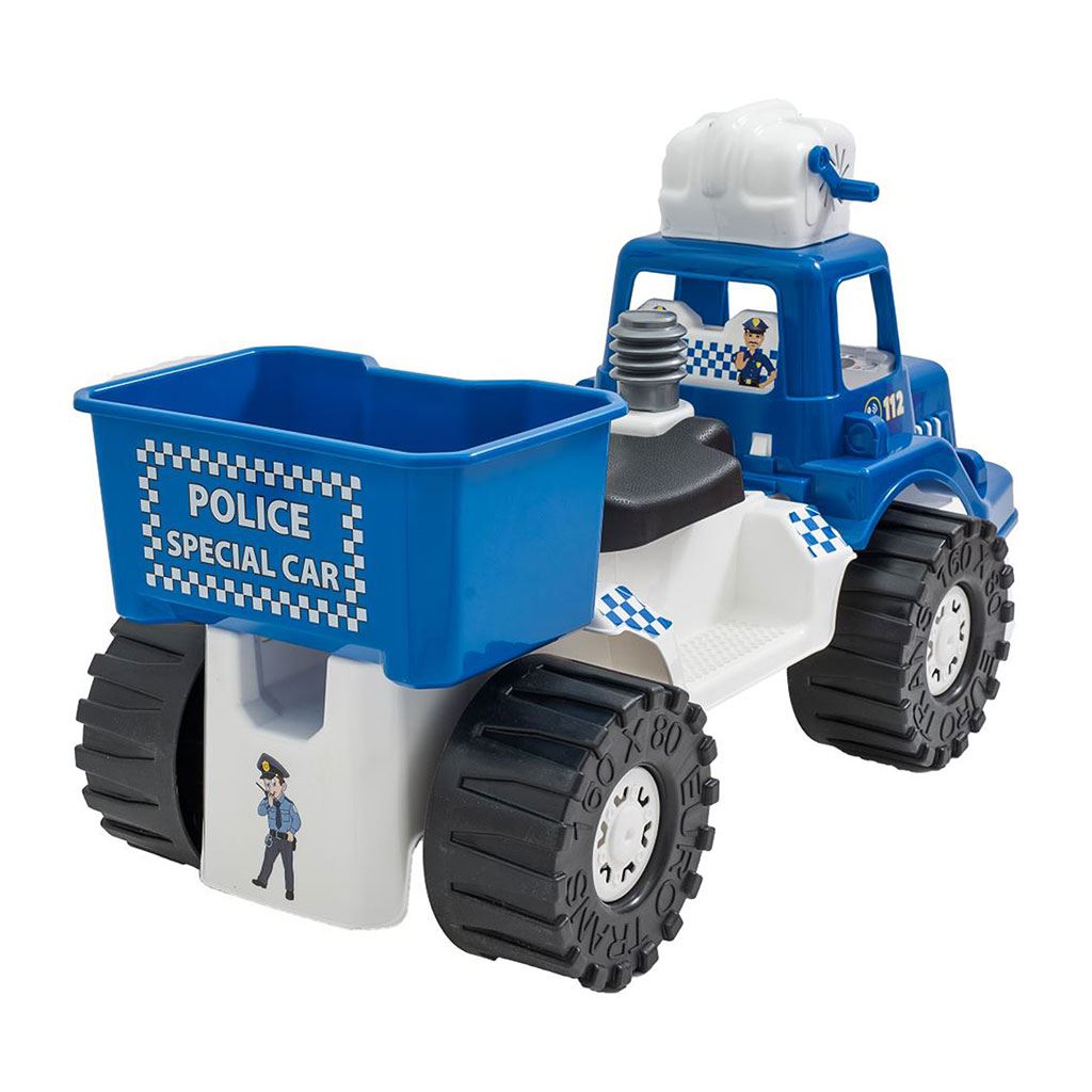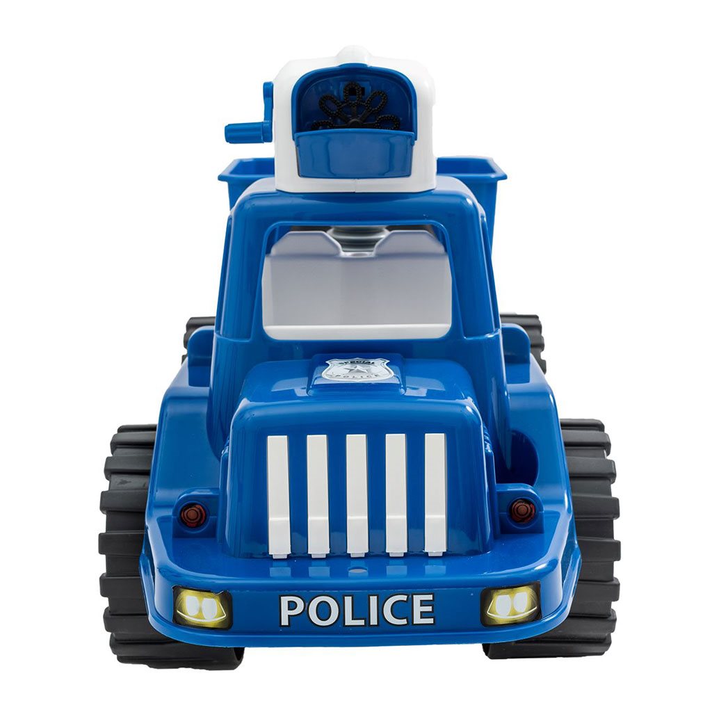 Policejní odrážedlo s bublifukem Bayo dokáže vytvořit nekonečné množství bublin. Na kabině vozu je bublifuk, ze kterého po nalití mýdlového roztoku a roztočení klikou vylétají bubliny.