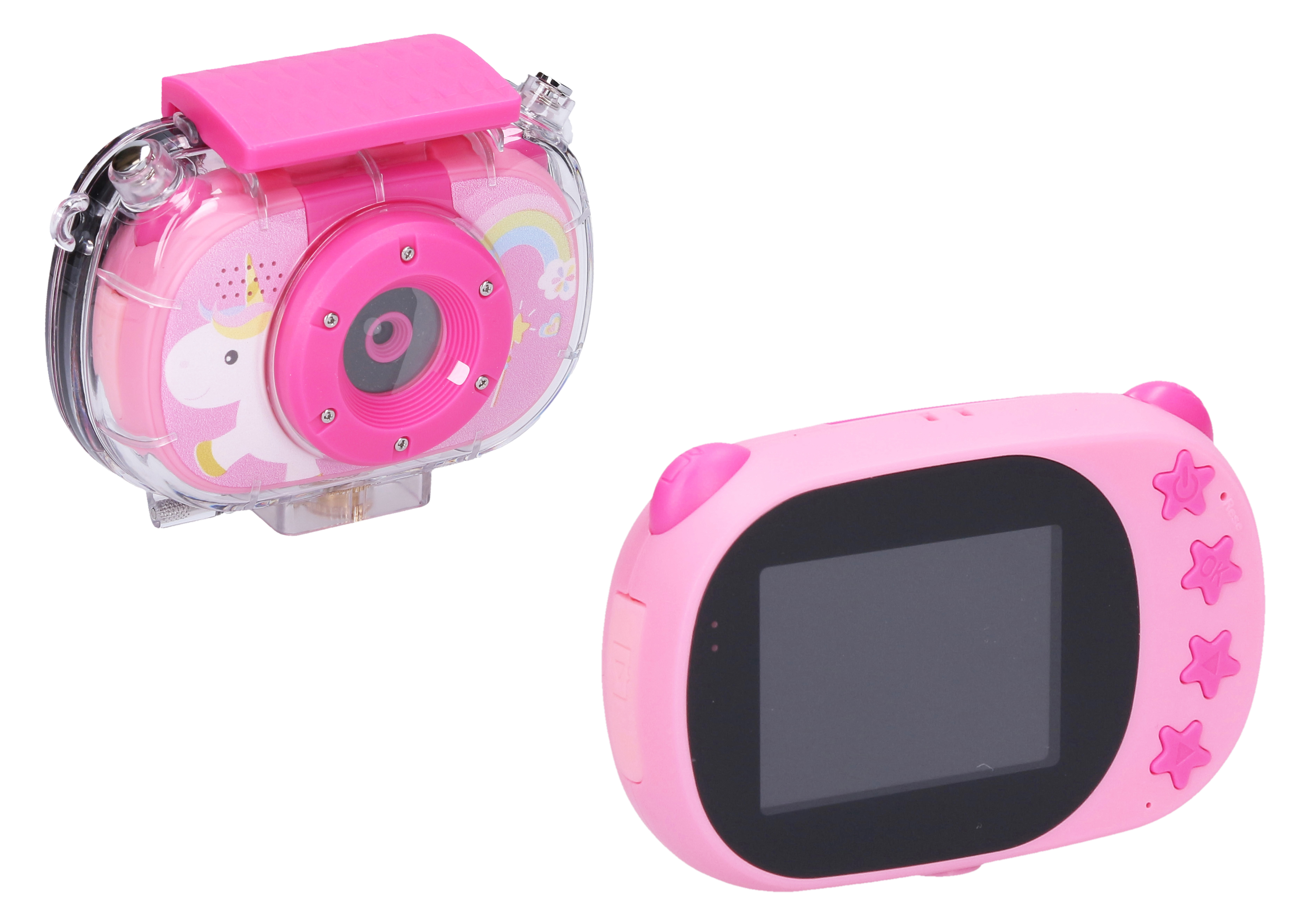 Dětský digitální fotoaparát s vodotěsným pouzdrem - foto 20Mpx, video Full HD. Rozměry 8x2,5x5,5 cm. Výklopný objektiv - slouží i jako selfie kamera. Rozlišení fotografií 20 megapixelů, videa Full HD (1920x1080). Kamera přední/selfie, časovač, sériové snímání, digitální 10x zoom, vložení času, různé efekty (rámečky, vložené animace, filtry) fotografií, hry, mp3 přehrávač, 2,0 palcový displej. Vestavěná Li-ion baterie, USB kabel, popruh a vodotěsné pouzdro součástí. Formát fotografií jpg, videa avi. Vodotěsné pouzdro určeno maximálně do hloubky 10 m. Provoz 100 min. Kompatibilní s micro SD kartami - max. 32GB. Paměťová karta není součástí.