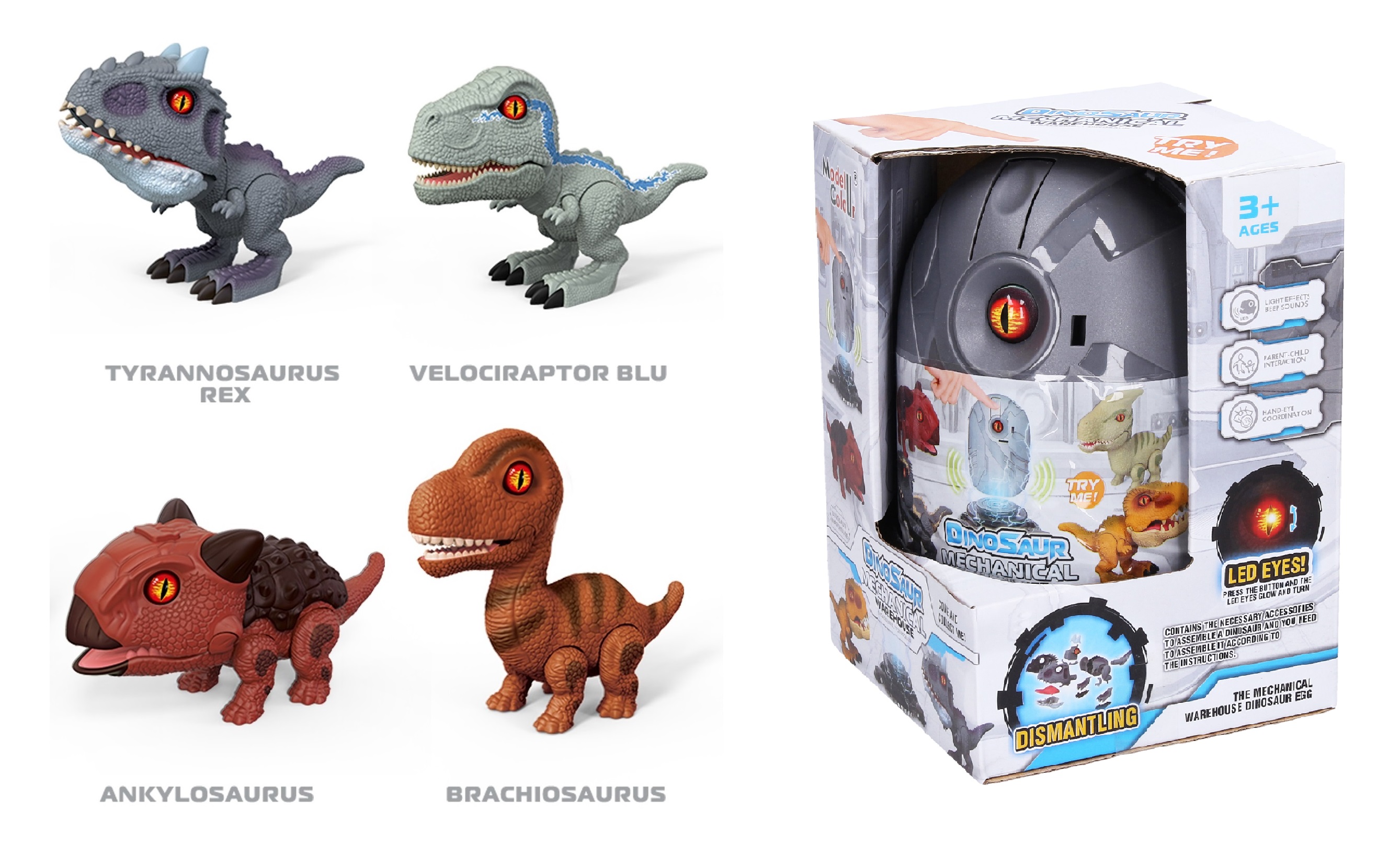 Dino ve vajíčku skládací s efekty. Vajíčko obsahuje díly na složení dinosaura a návod. Součástí jsou oči do nichž se vkládají baterie - svítí a vydávají zvuk. Oči jsou jedním z dílků skládačky dinosaura. 4 varianty - tyrannosaurus, velociraptor, ankylosaurus, brachiosaurus.
