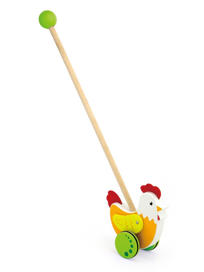 Krásná dřevěná hračka na tyči Viga slepička je skvělou alternativou tahacích hraček pro děti. Perfektní edukační hračka. Ideální na společné procházky a hraní doma. Užijete si sní spoustu legrace, radosti a zábavy. Gumové prvky připojené na kola vtipným způsobem napodobují chůzi zvířat. Hračka pomáhá zlepšit manuální zručnost a obratnost, učí dítě rozpoznat tvary a barvy, zapojuje a rozvíjí smysl pro pozorování. Hračka je vyrobena z lakovaného dřeva. Naší prioritou je bezpečnost a kvalita našich výrobků, a proto barvy použité na hračkách nejsou toxické a splňují bezpečnostní standardy (EN71 a ASTM). Rozměry hračky: dxvxš 15x8,3x5,6 cm. Určeno pro děti od 2 let. Hračka je vhodná jako krásný dárek pro naše nejmenší.