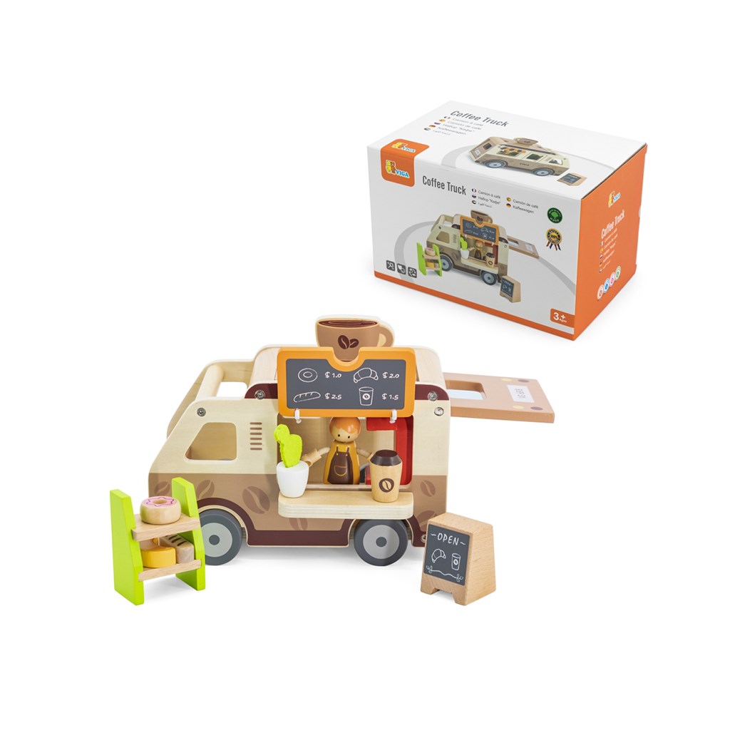 Pevná dřevěná konstrukce a jemné pastelové barvy nanesené netoxickými barvami činí hračku nejen esteticky příjemnou, ale i bezpečnou pro nejmenší. Sada je navržena s ohledem na rozvoj představivosti, manuálních dovedností a sociálních schopností dětí a nabízí mnoho hodin kreativní zábavy. Perfektní pro děti, které milují dobrodružství a sní o vlastní mobilní kavárně na kolech.