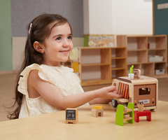 Dřevěná mobilní kavárnička je mimořádně kreativní a pečlivě zpracovaná hračka, která děti přivádí do fascinujícího světa kavárenských dobrodružství. Díky realistickým prvkům mohou děti vystoupit v roli baristy a obsluhovat své „zákazníky“, což činí hru velmi poutavou. Kavárnička nejen baví, ale také podporuje rozvoj dítěte v mnoha směrech: rozvíjí fantazii, motoriku i sociální dovednosti. Hra na přípravu kávy a podávání pokrmů rozvíjí empatii i komunikační schopnosti a učí děti interakci v různých situacích.