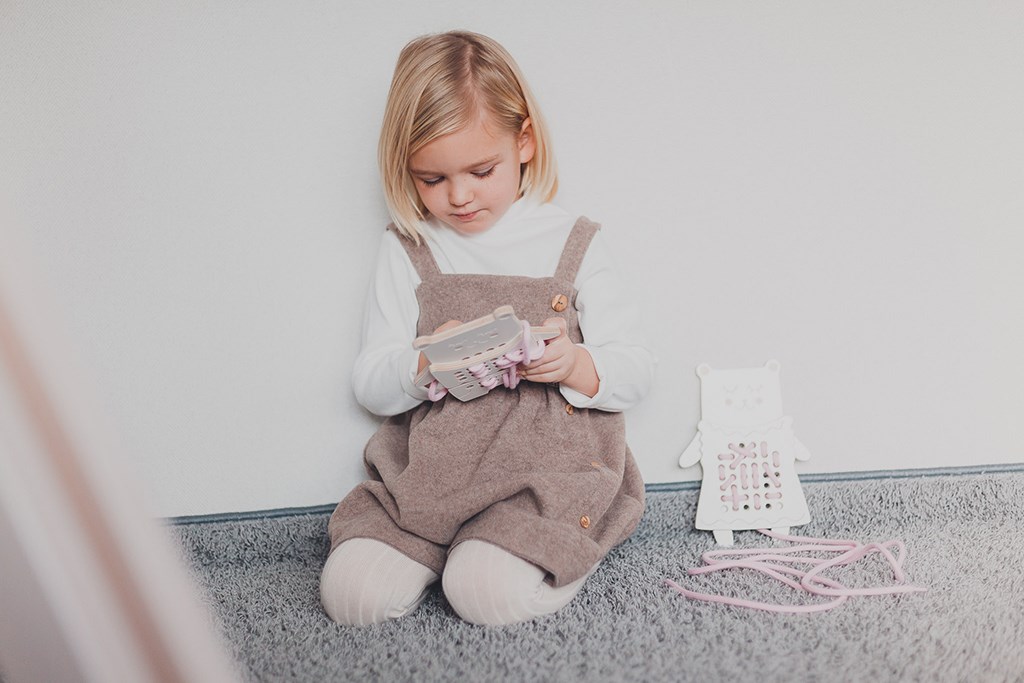 Dřevěná Montessori provlékačka Slečna medvědice-pokročilá úroveň