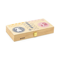 1 herní deska, která je v uzavíratelné dřevěné krabičce.