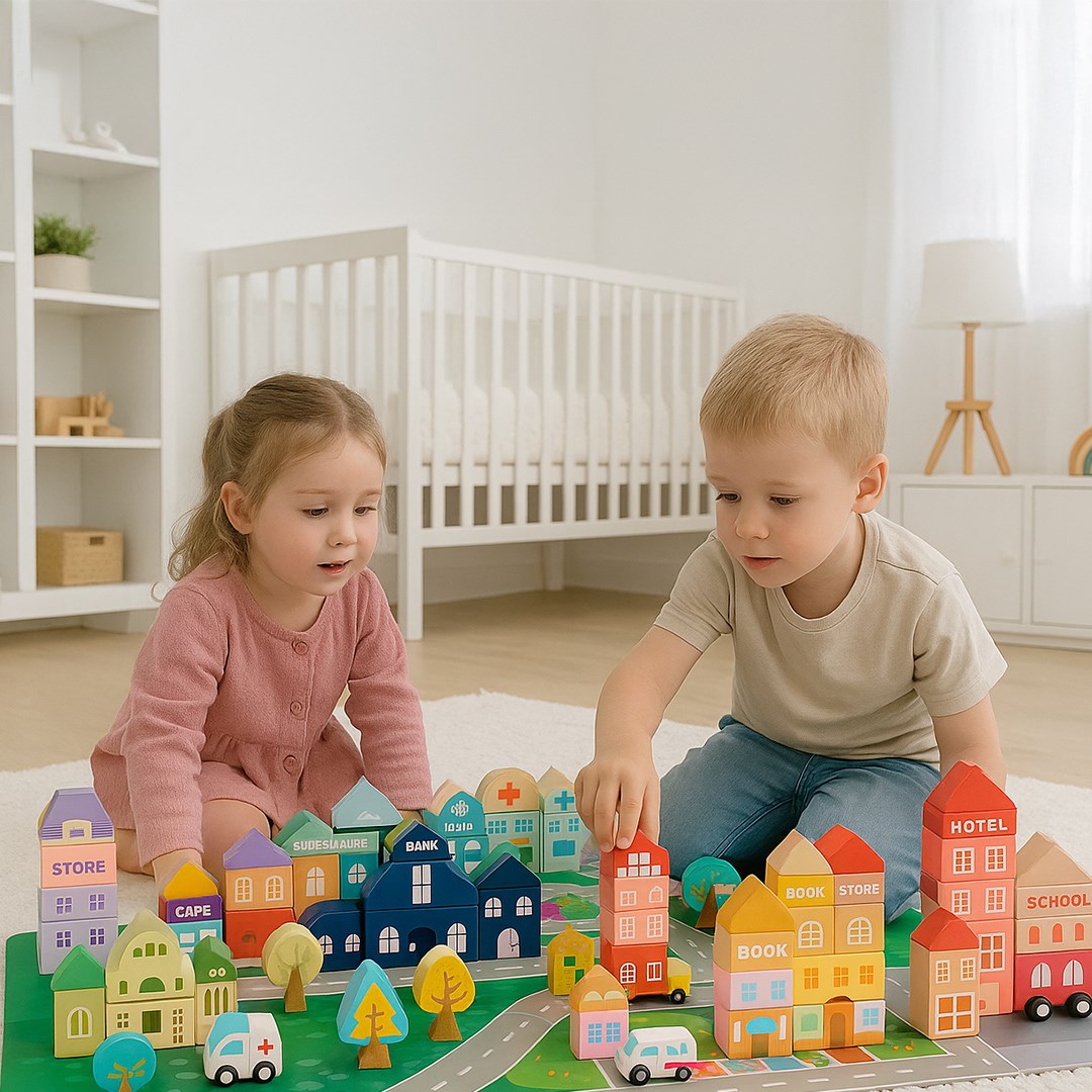 Kreativní a zábavná hra – různé tvary kostek umožňují dětem stavět městské struktury, plánovat ulice, budovy a tvořit vlastní městské prostředí
