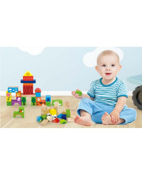 Krásné, barebné, dřevěné kostky v kyblíku Viga Farma Přináší 50 krásně barevných dílů i pro ty nejmenší stavitele. Stavebnice vydrží dlouhou dobu a dává vašemu dítěti mnoho let zajímavé a tvůrčí hry. Kostky mají různé tvary, velikosti, krásné barvy a obrázky s motivem zoo. Najdete zde tvary jako krychle, kvádr, trojuhleník, válec, obdélník, most, ad. Uvnitř balení je návod na skládání různých budov, měst a objektů, která inspiruje vaše dítě k tvůrčí zábavě. Tento kyblík s kostkami tak slouží jako motorická pomůcka, která děti učí poznávat tvary a zacházet s kostkami. Hračka pomáhá zlepšit manuální zručnost a obratnost, učí dítě rozpoznat tvary a barvy, zapojuje a rozvíjí smysl pro pozorování. Hračka je vyrobena z lakovaného dřeva. Naší prioritou je bezpečnost a kvalita našich výrobků, a proto barvy použité na hračkách nejsou toxické a splňují bezpečnostní standardy (EN71 a ASTM). Pro děti od 2 let. Hračka je vhodná jako krásný dárek pro naše nejmenší.