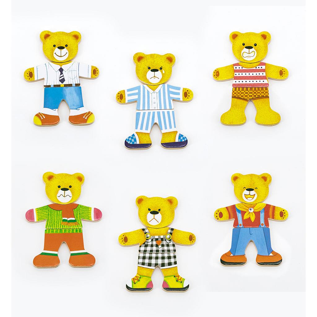 Sada obsahuje 18 dílků (6 x obličej medvídka - každý v jiné náladě, 6 x horní část těla a 6 x kraťasy), které lze libovolně sestavit na speciální podložce, která je zároveň víkem krabice.