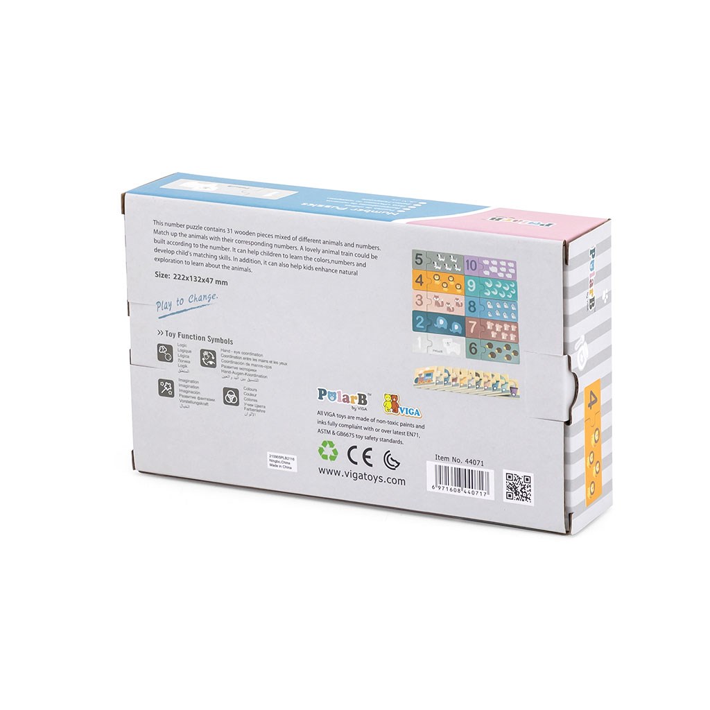 Toto puzzle obsahuje 31 dřevěných dílků s různými zvířaty a čísly.