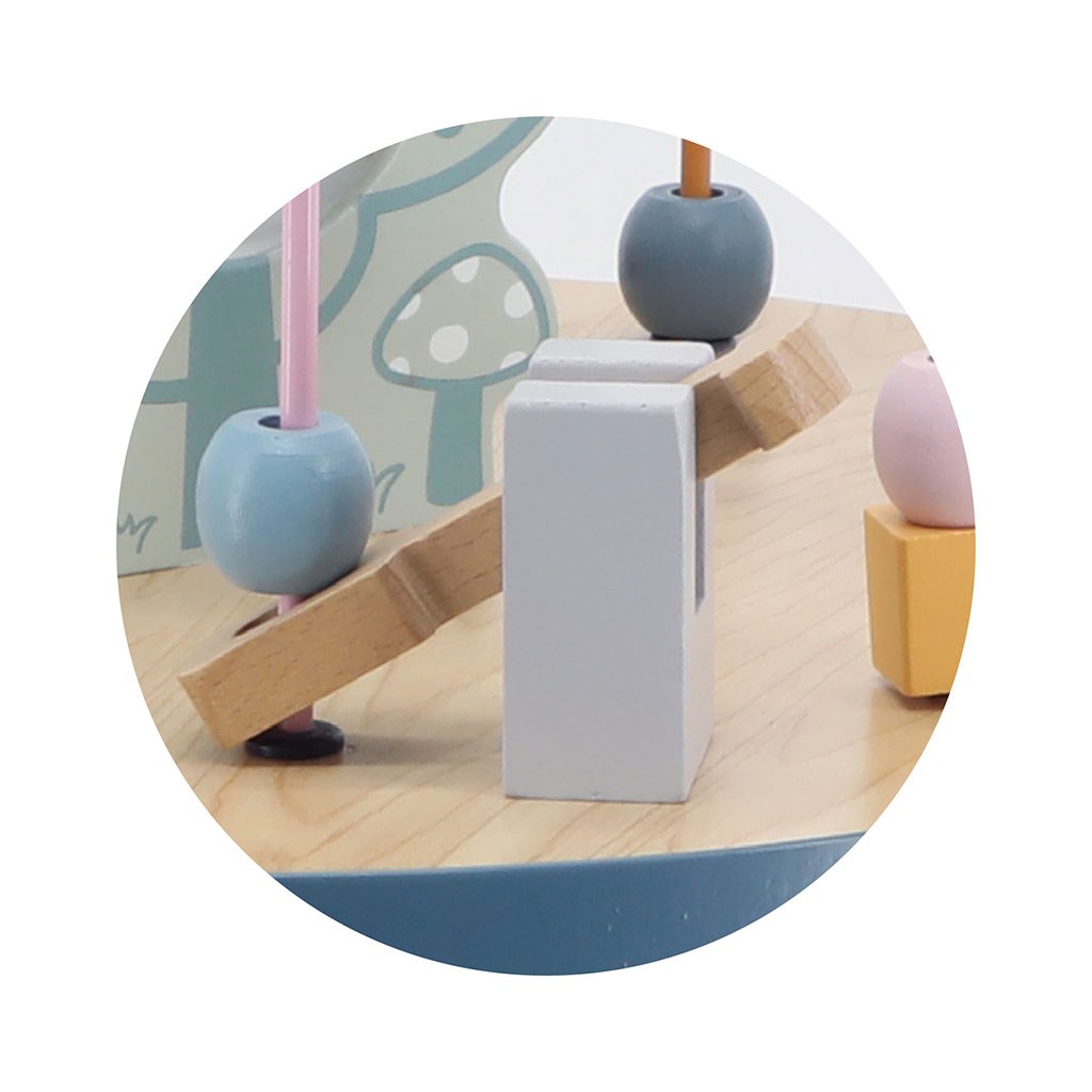 Hračka se skládá ze stolu, na kterém jsou umístěny 4 prostorové kovové smyčky s korálky a figurky zvířátek medvěda, veverky a ježka k pohybu. Na desce stolu jsou také ozubená kolečka s dalšími figurkami zvířátek (lev, slon a liška) - stačí jimi zatočit a všechny se dají do pohybu.