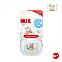 Kojenecký dudlík Star NUK 6-18 měsíců. Dudlík má krásný obrázek s motivem Disney. Ortodontický tvar podporuje vývoj celé ústní dutiny dítěte. Dudlík je vyroben z vysoce kvalitního plastu a silikonového dudlíku. Výhodou silikonu je to, že je bez zápachu a lehce se čistí. Neobsahuje BPA. Dudlík je dodáván v plastovém boxu, který slouží jako kryt před ušpiněním a je vhodný i na sterilizování v mikrovlnce. Všechny NUK dudlíky jsou pravidelně testovány a sledovány nezávislými instituty. Vhodný pro správný vývoj čelisti, a zvláště šetrný při kojení, snadné střídání kojení a tišení dudlíkem