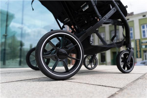 Velká kola – vpředu 7" (~18 cm), vzadu 9,5" (~24 cm), s možností zablokování do rovného směru a odpružením na přední i zadní ose.