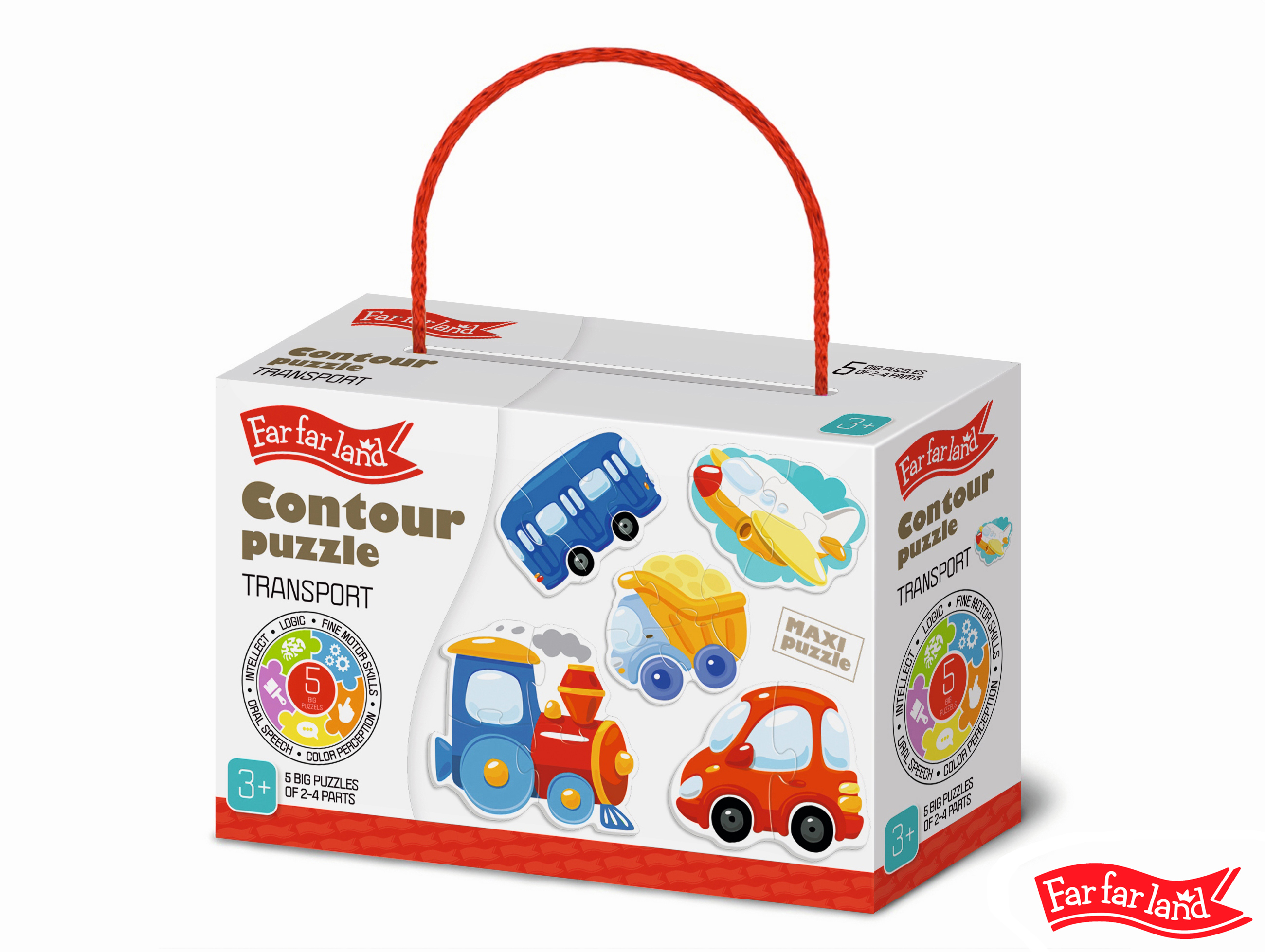 Puzzle obrysové pro děti, motiv dopravní prostředky. Balení obsahuje 5 puzzle obrázků, které se skládají ze 2 - 4 dílků.