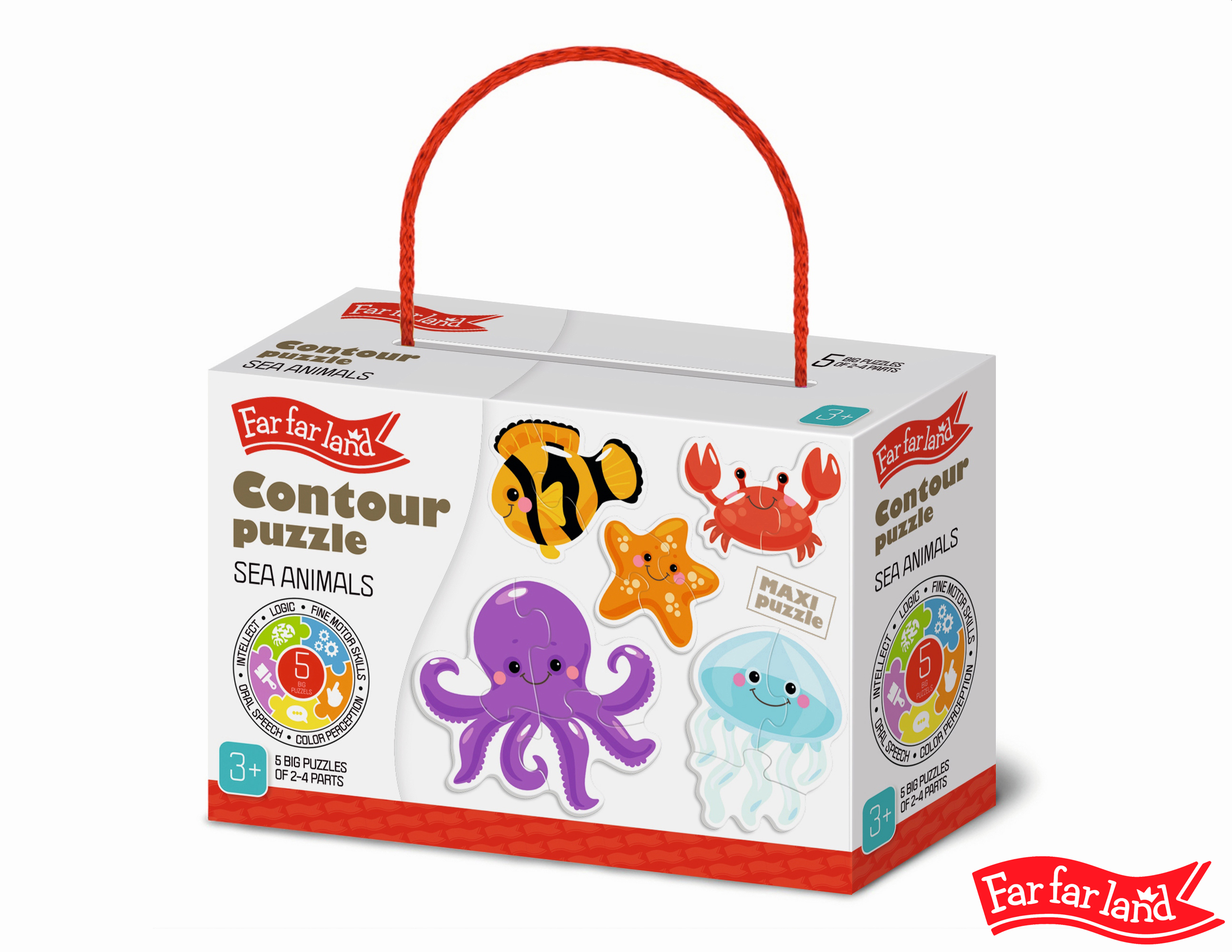Puzzle obrysové pro děti, motiv mořská zvířátka. Balení obsahuje 5 puzzle obrázků, které se skládají ze 2 - 4 dílků.