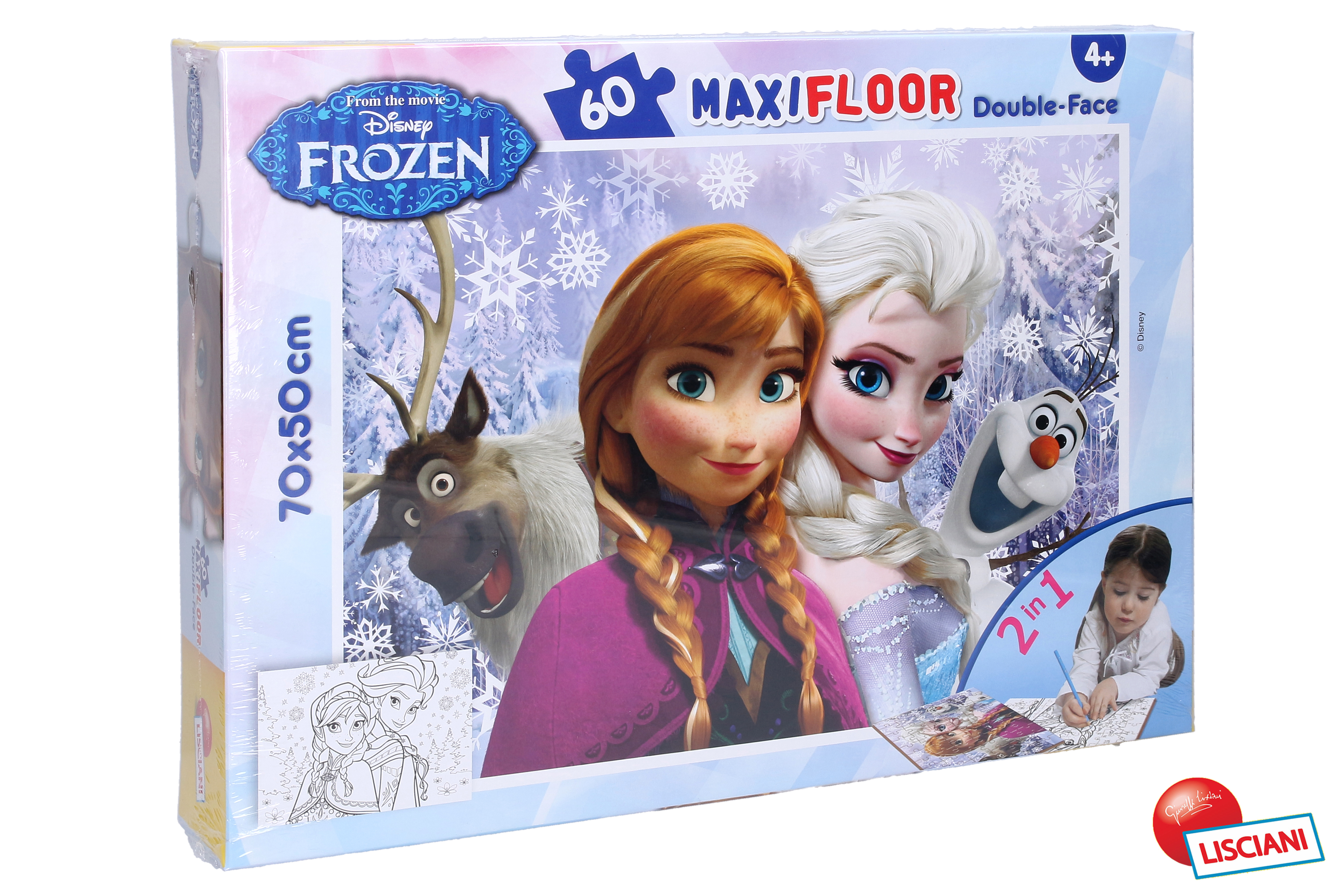 Lisciani Frozen Puzzle MaxiFloor 60 oboustranné 2v1. Oboustranné puzzle, 60 dílků. Rozměry 70 x 50 cm. Obrázek Elsa a Anna. Přední strana s barevným obrázkem, na zadní straně předkreslený k vymalování.