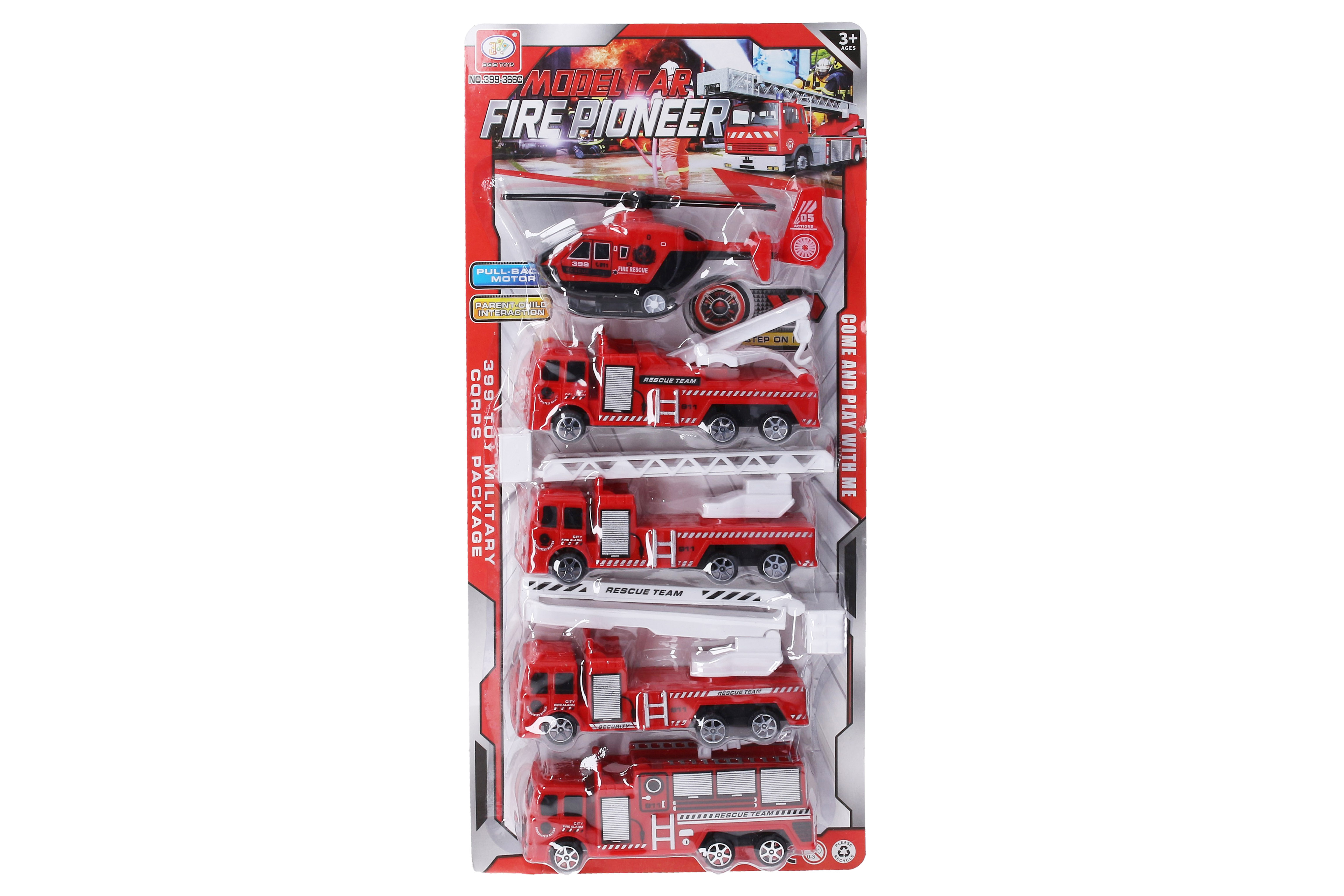 Hasičský set. Na zpětné natažení a volná kola. Součástí vrtulník, 4 auta. Velikost auta 17 cm.