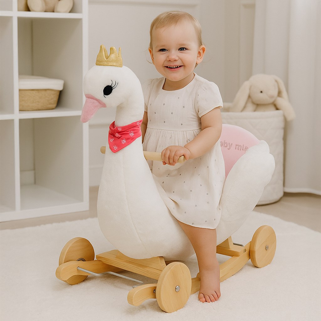 Vestavěná melodie dělá z houpání na labuti ještě větší zábavu, stimuluje sluch dítěte a povzbuzuje ho k aktivní hře. Hračka je také vybavena kolečky, která umožňují pohyb na různých površích a zajišťují bezpečnost a stabilitu.