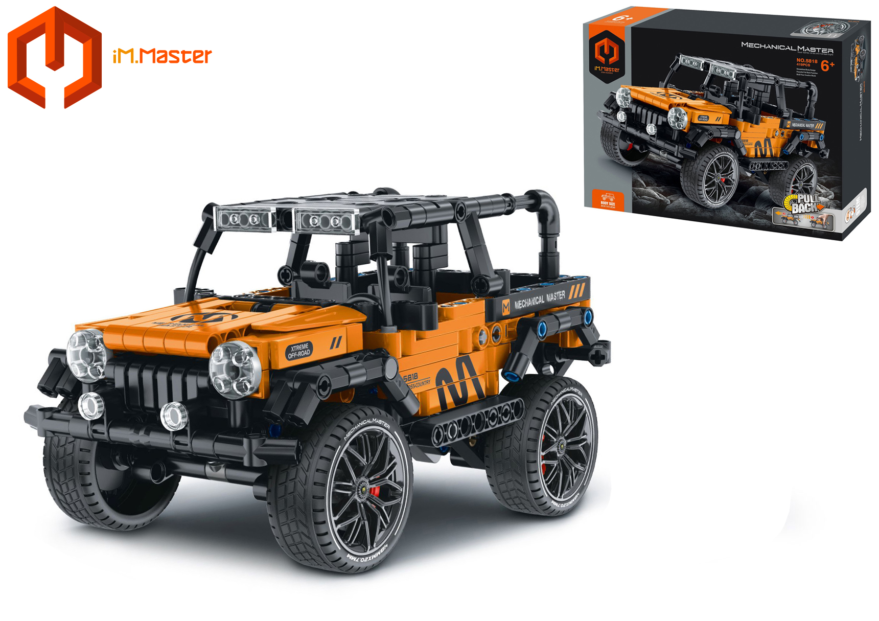iM.Master Stavebnice terénní auto. Rozměry 20,3x11x11,2 cm. 434 dílků. Na zpětné natažení. Otevírací dveře, funkční zadní tlumiče.