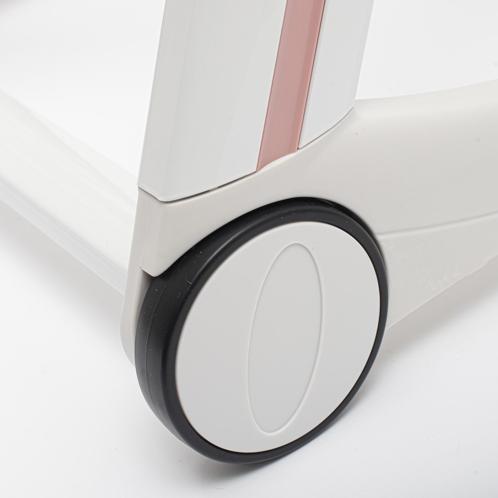 -Jídelní židlička je vybavena dvěma brzděnými kolečky a dvěma gumovými nožičkami.
