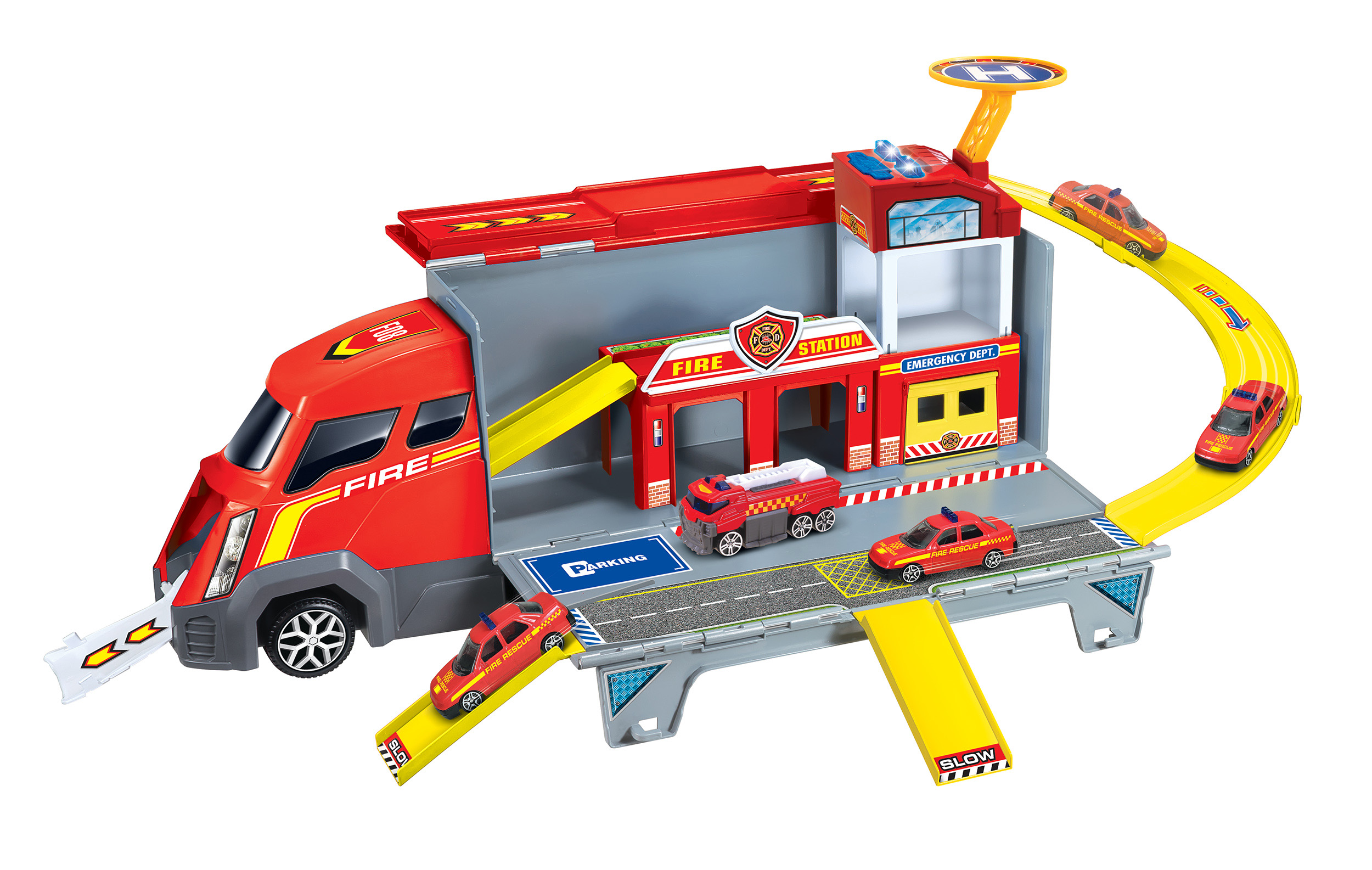 Kamion hasičská stanice rozkládací. Velikost 46cm. Obsahuje 2 autíčka,, vrtulník, kamion, který lze rozložit na hasičskou stanici s nájezdy pro autíčka. Světelné a zvukové efekty se aktivují na střeše stanice tlačítkem. Madlo pro přenášení. 2xAA baterie součástí.