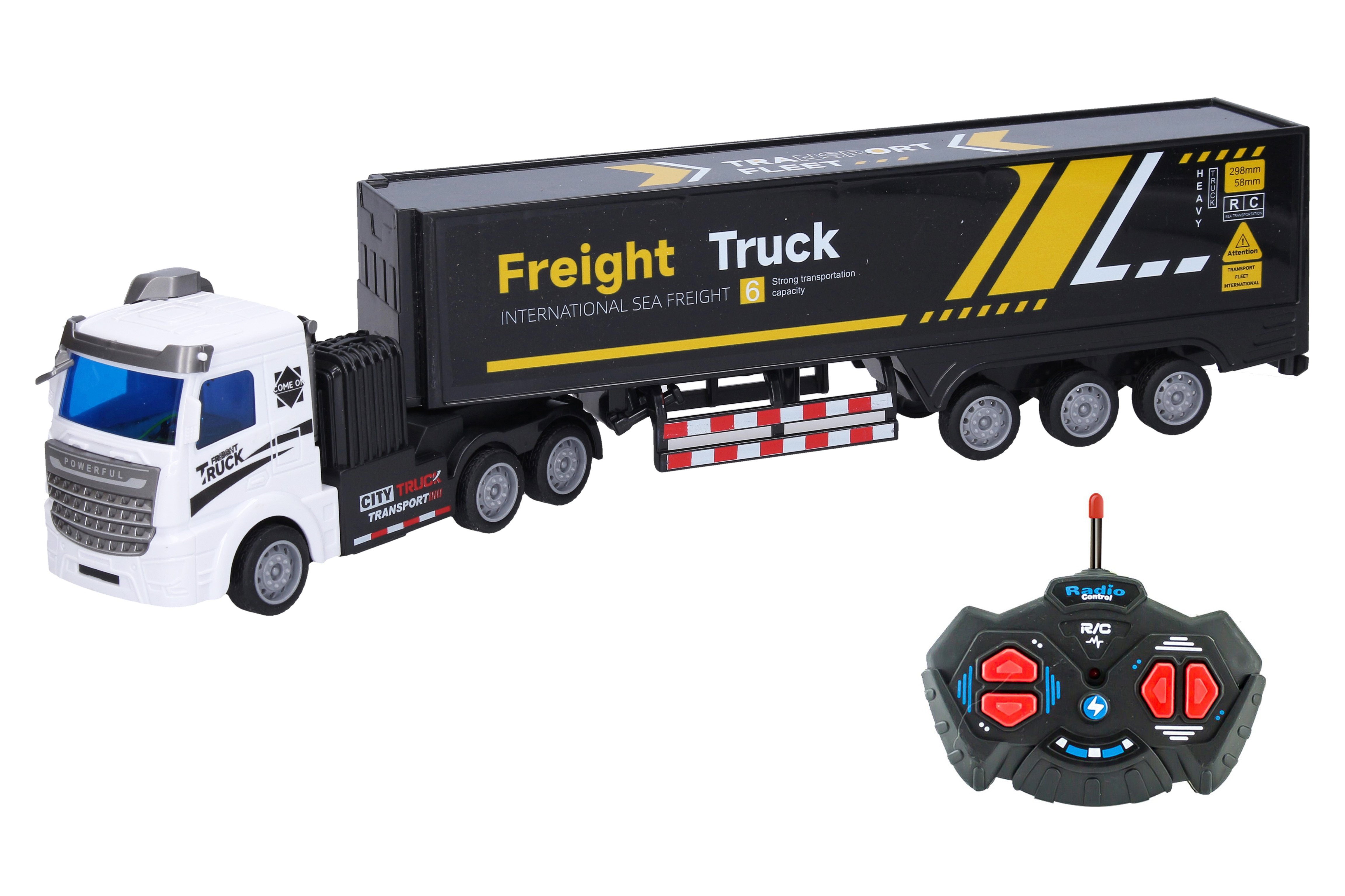 Kamion RC na dálkové ovládání. Rozměry 41x11,5x6,5 cm. Frekvence 27 MHz. Světelné efekty. 3.7V bateriový pack do kamionu součástí, 2xAA do ovladače není součástí. USB kabel součástí. Přepínač ON/OFF na spodní straně kamionu.