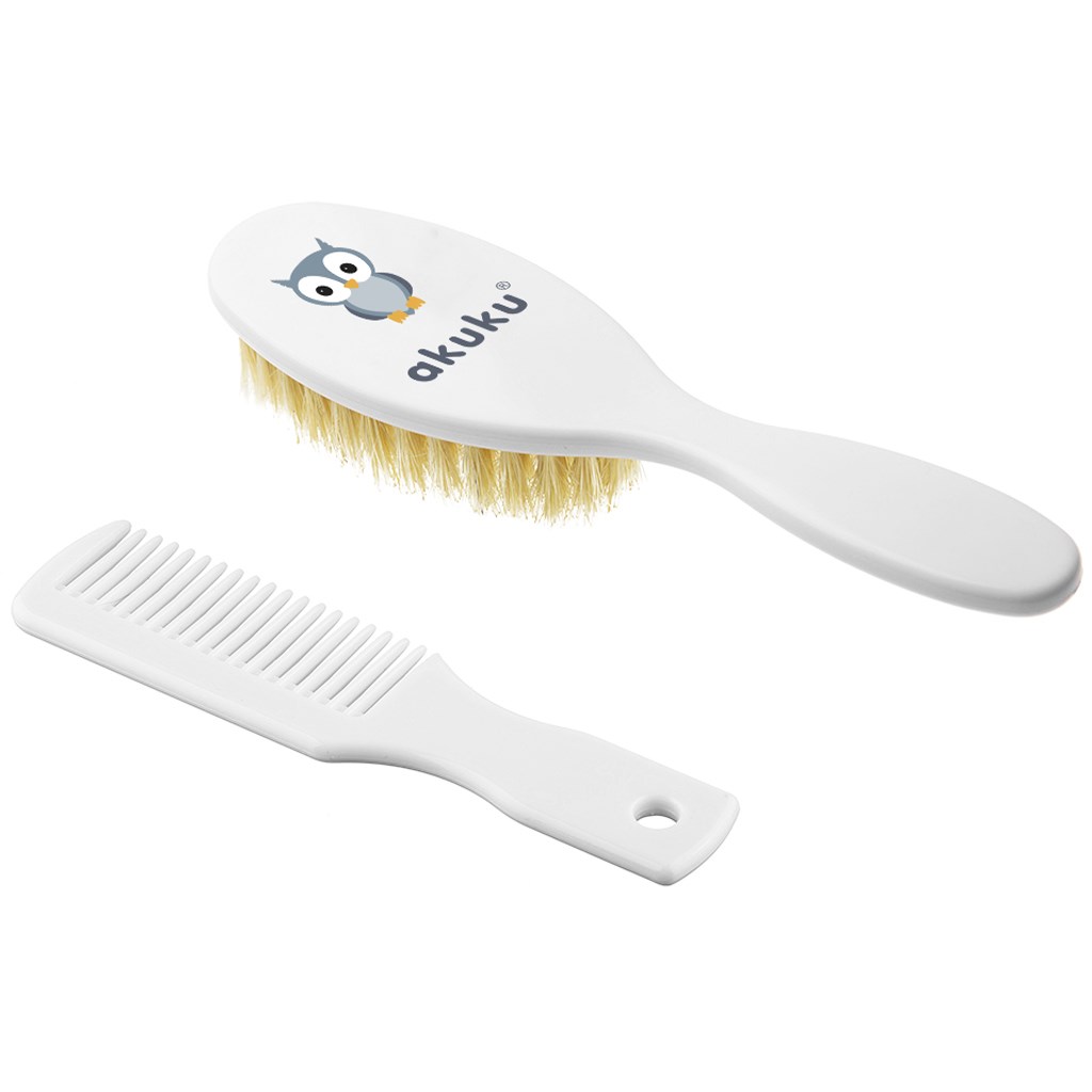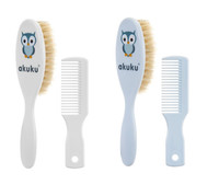 Kartáček a hřebínek s přírodním vlasem Akuku. Kartáček jemně masíruje pokožku hlavy miminka a tak podporuje prokrvení pokožky a posiluje vlasy a upravuje je. Zakulacené zuby hřebene nedráždí pokožku hlavy. Vyrobeno bez BPA. Rozměry: hřebínek: cca 11 cm, kartáček: cca 15 cm. Vhodné pro děti od narození.