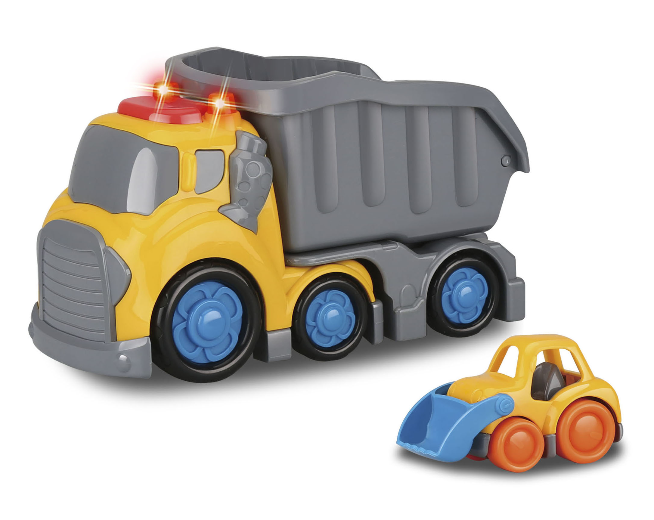 Balení obsahuje sklápěcí auto s efekty 19,5 cm a malý buldozer 8 cm.