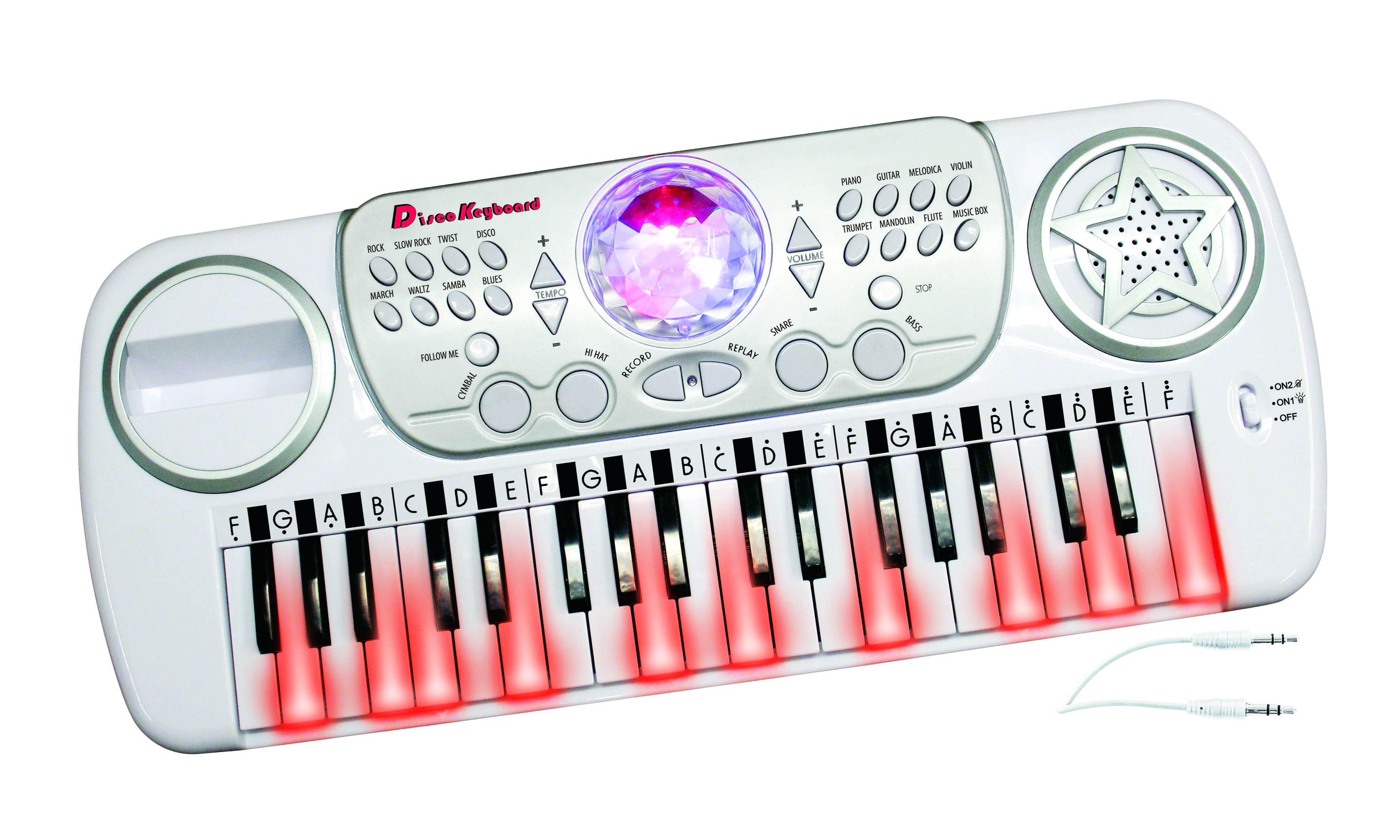 Klávesy s disco koulí a mikrofonem. Rozměry 50x21 cm. Disco koule se světelnými efekty. 37 kláves (bílé, černé). Funkce - výuka (hrajte podle světýlek a naučte se hrát), 22 ukázkových skladeb, 8 nástrojů, 8 rytmů, nastavení rychlosti tempa, 4 bicí, nahrávání a následné přehrávání, nastavení hlasitosti, konektor na připojení mobilu/mp3 přehrávače, automatické vypínání pro úsporu energie. 4xAA baterie a kabel na připojení externího zařízení součástí.